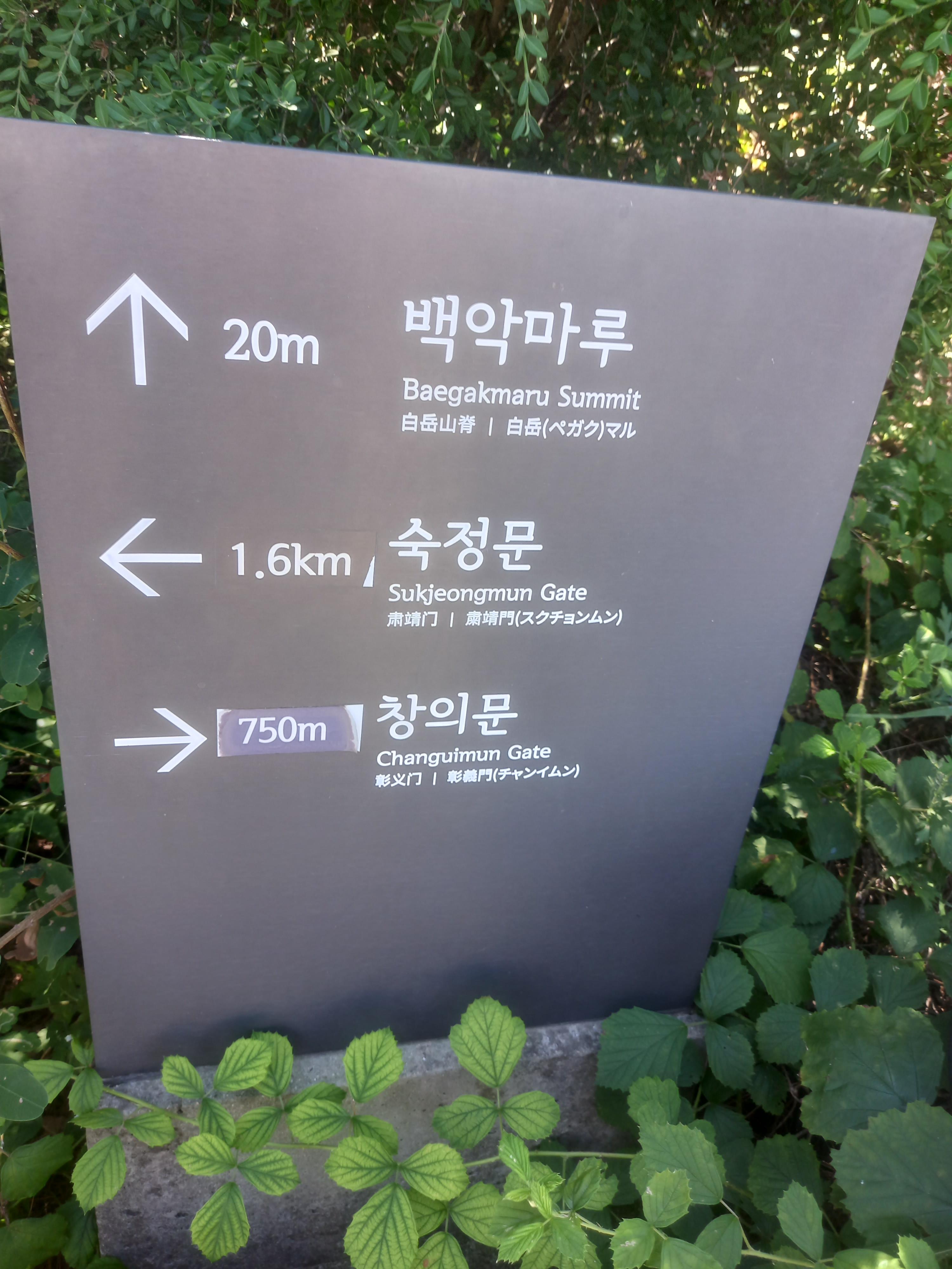 →이정표(10:57 / [우측] 백악마루-20m / [후] 창의문-750m / [직진] 숙정문-1.2Km)