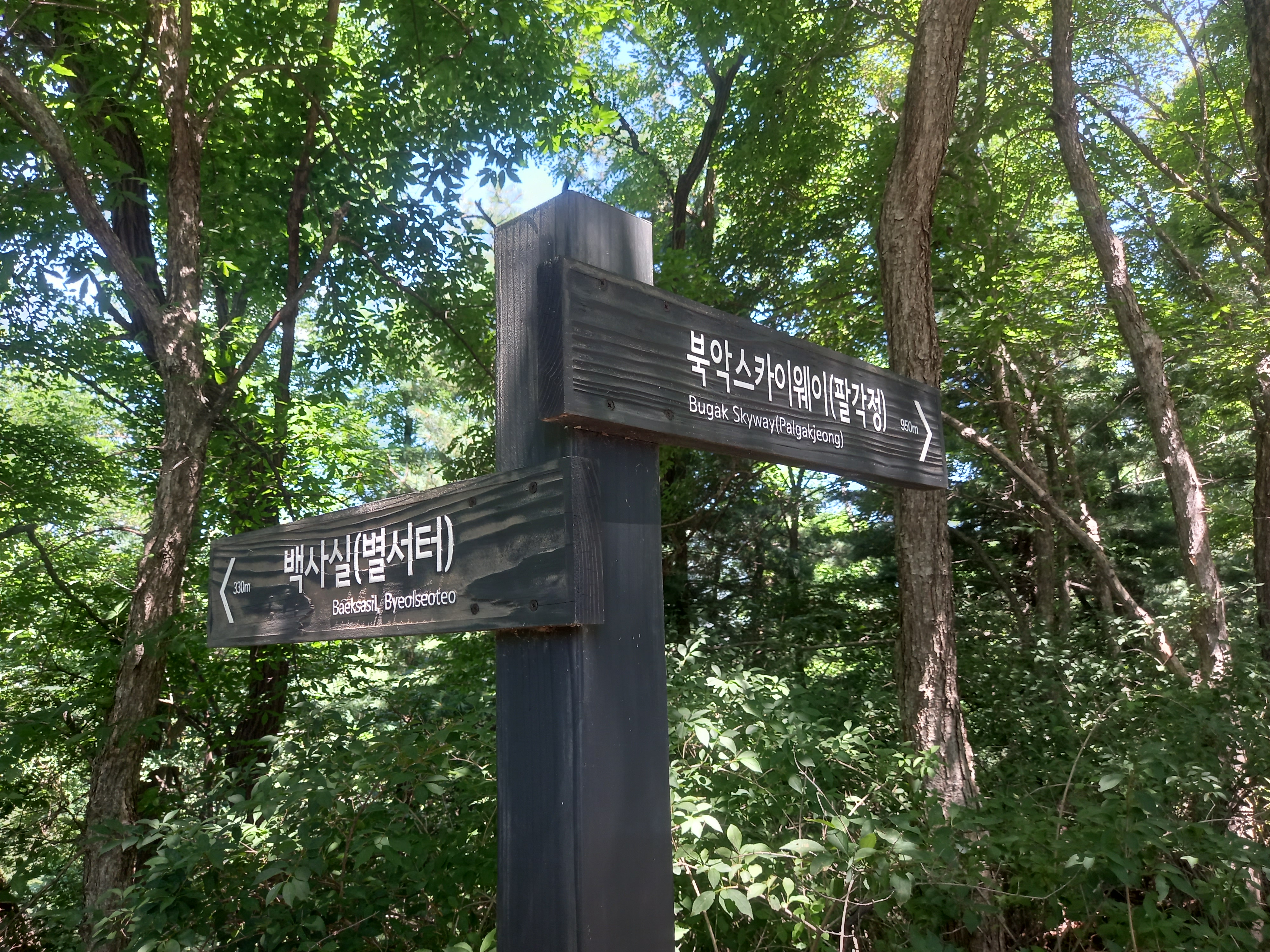 <창의문에서 북악산 정상 방면 등산로의 백악 쉼터 이정표>