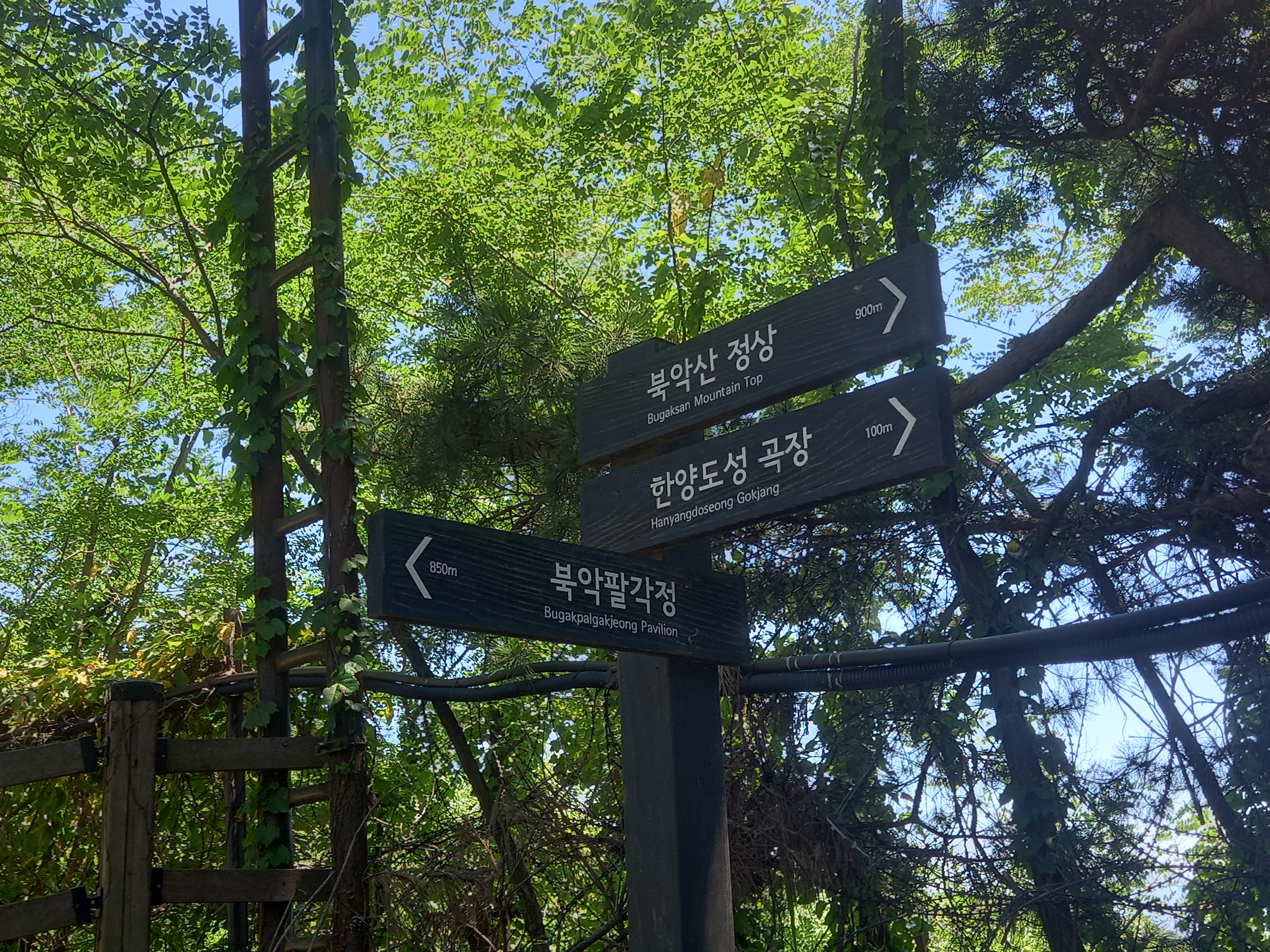 →곡장(백악 곡성 / 11:24 / [직진] 북악산 정상-800m / [우측] 곡장안내소-100m / [우측] 북악팔각정-950m)