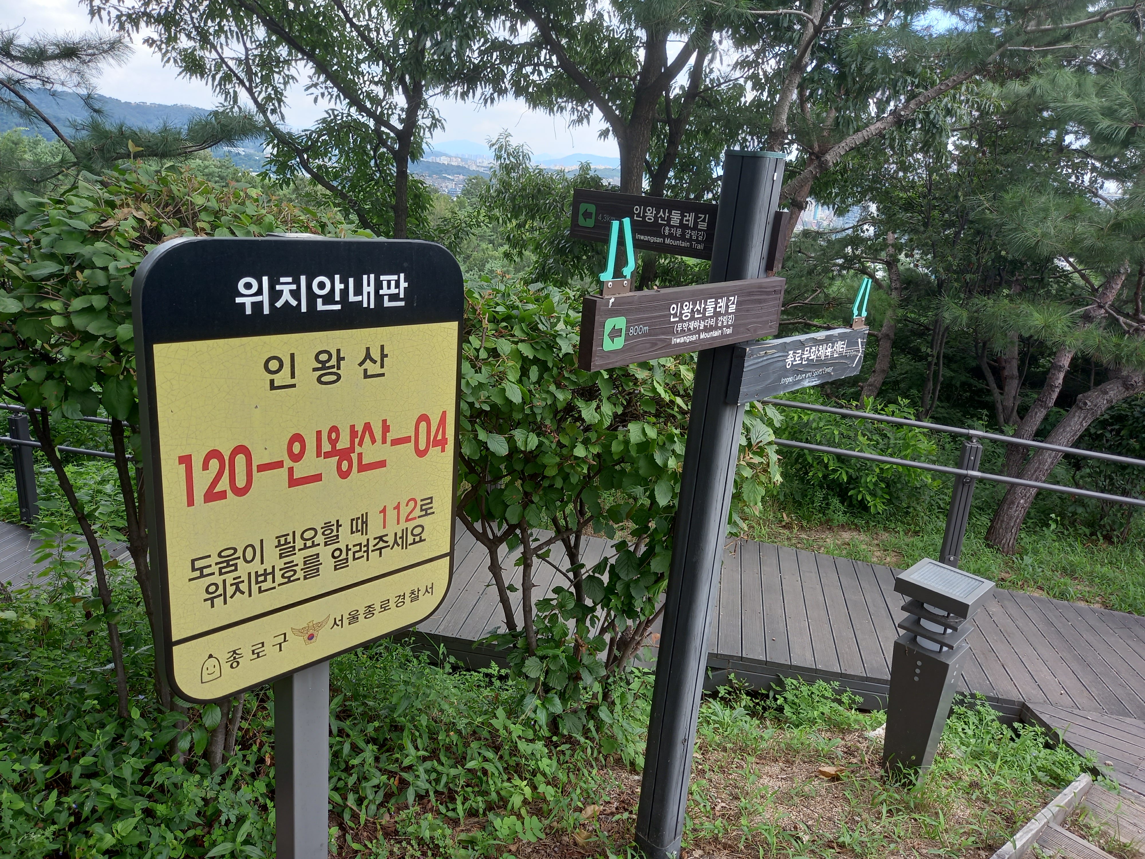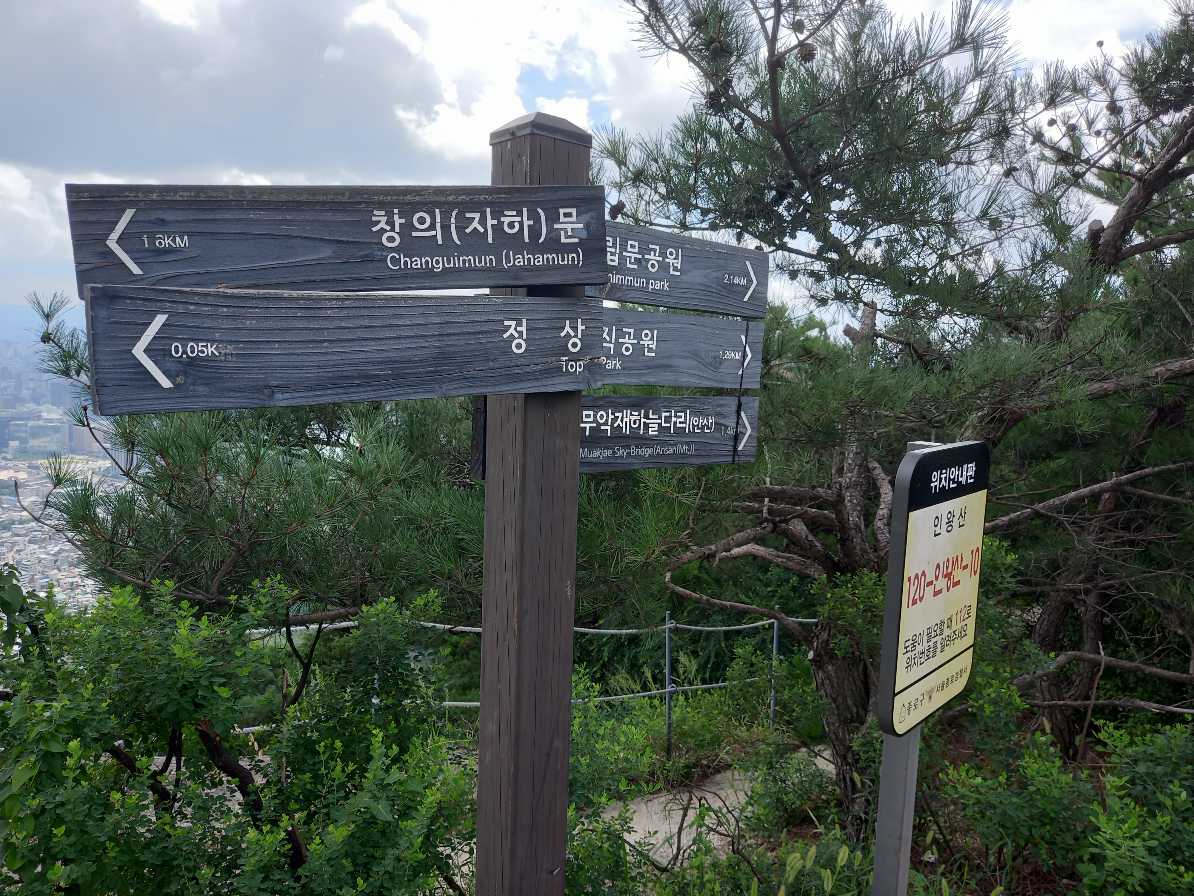 →사직 전망대(120-인왕산-02 / 10:48 / [직진] 인왕산도시자연공원-1000m / [직진] 선바위-750m / [직진] 무악재 하늘다리[안산]-1.5Km / [좌측] 서대문독립공원-700m / [후] 종로문화체육센터-250m)