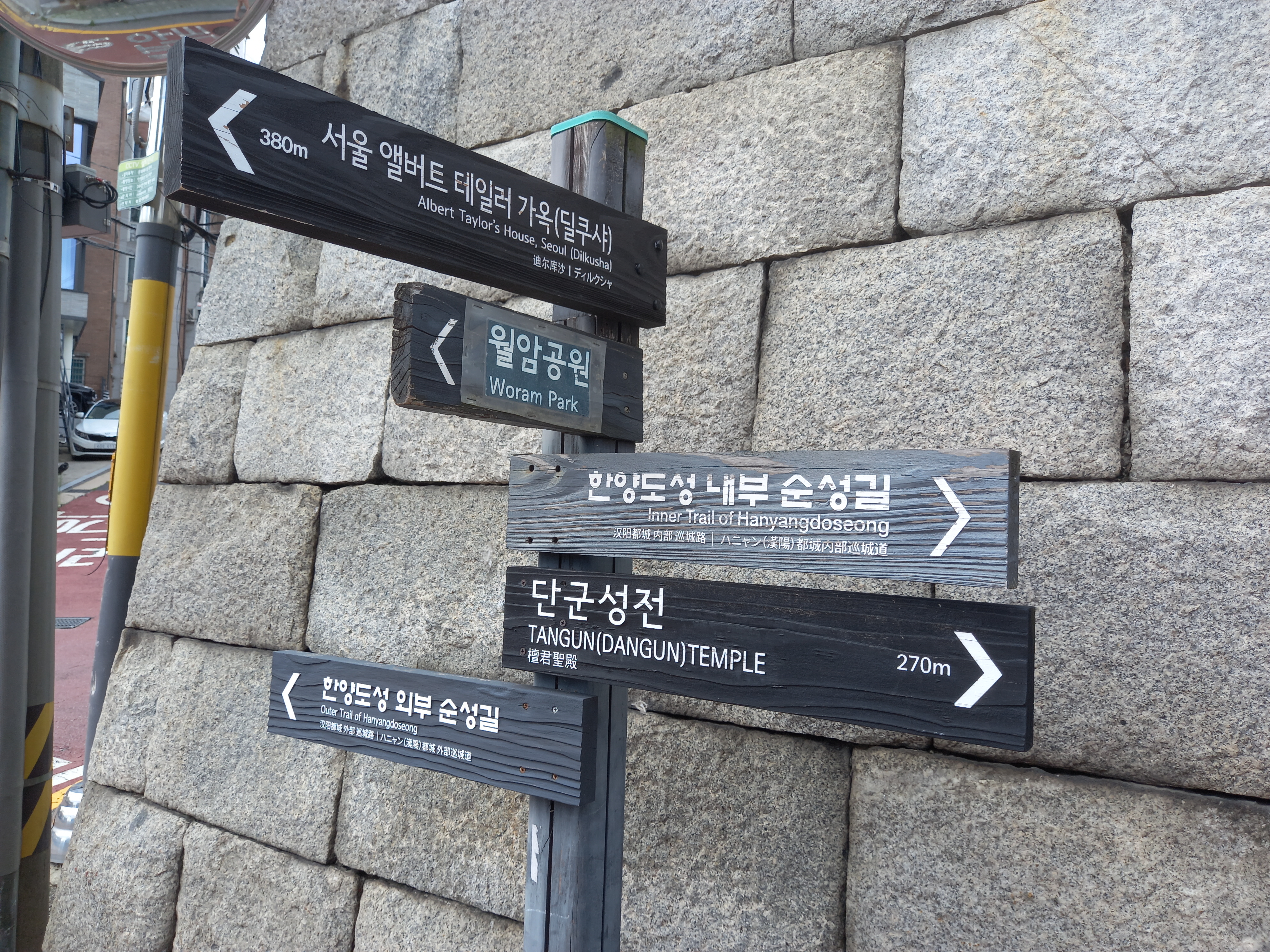 →이정표(종로문화체육센터 / 10:45 / [후] 서울 앨버트 테일러 가옥[딜쿠샤]-380m / [후] 월암공원 / [좌측] 한양도성 외부 순성길 / [우측] 단군성전 / [우측] 한양도성 내부 순성길)