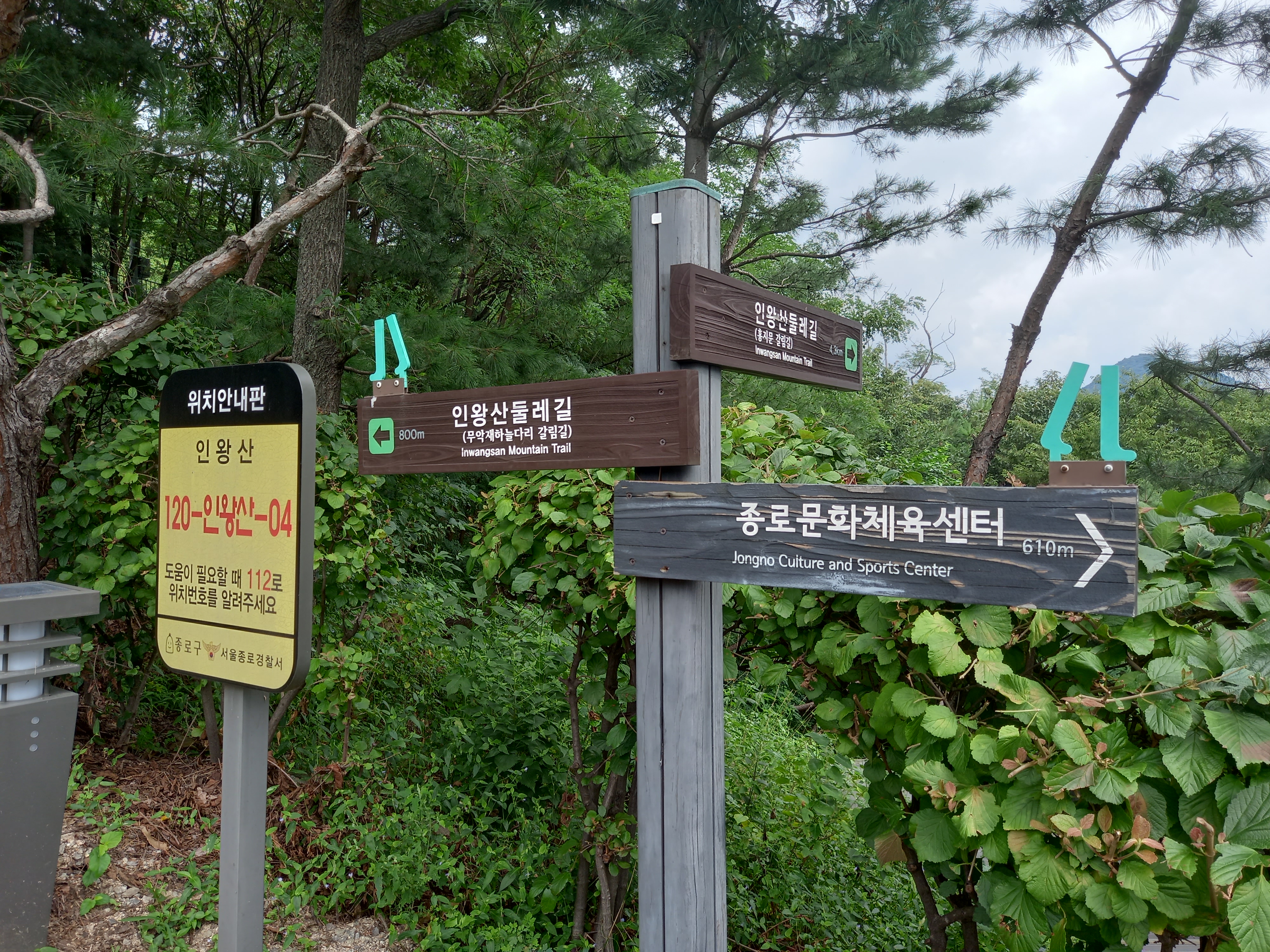 <종로문화체육센터와 인왕산 둘레길 방면 갈림길 이정표>