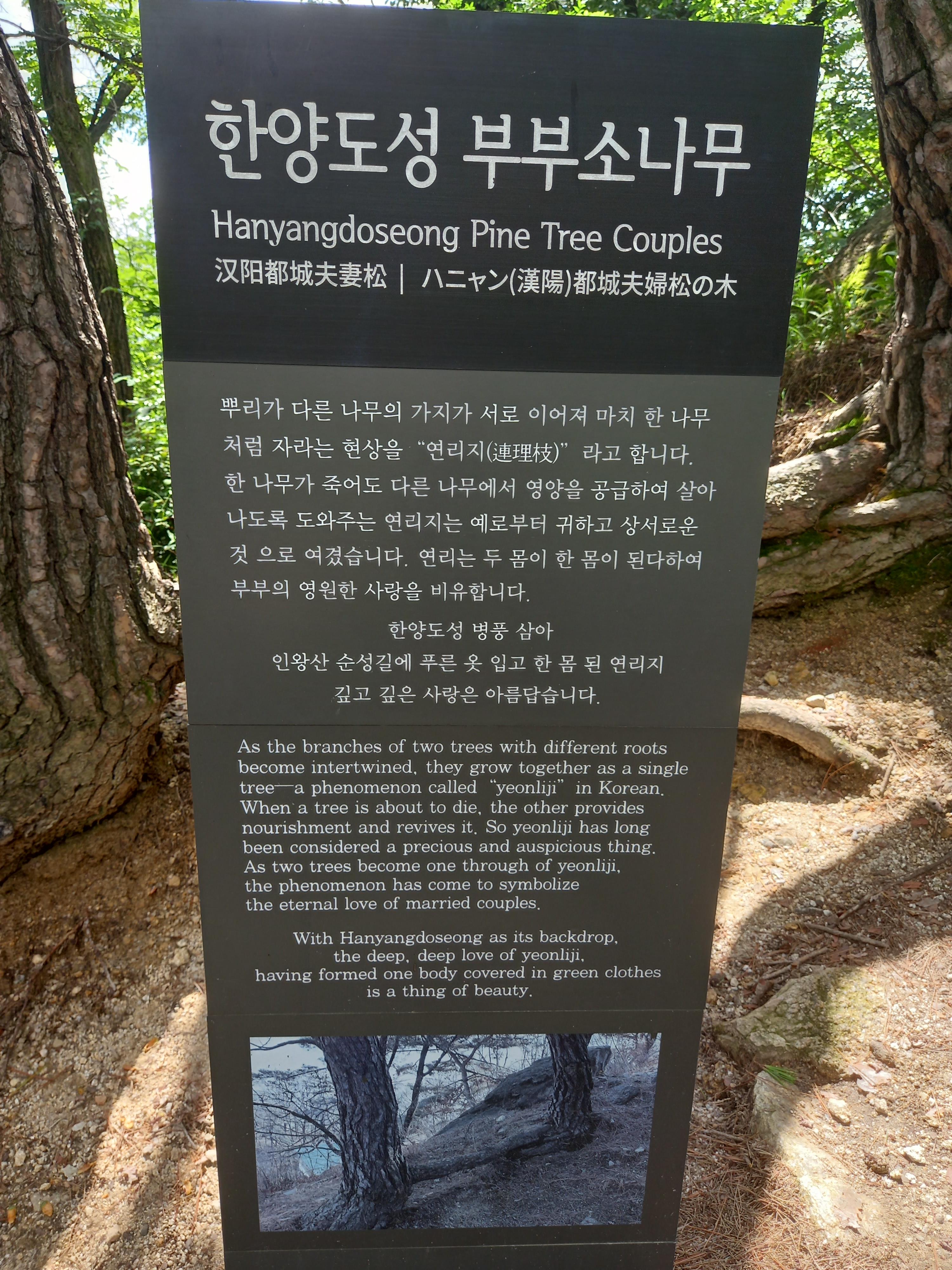 <인왕산 정상에서 창의문 방면 하산로의 한양도성 부부 소나무 안내문>