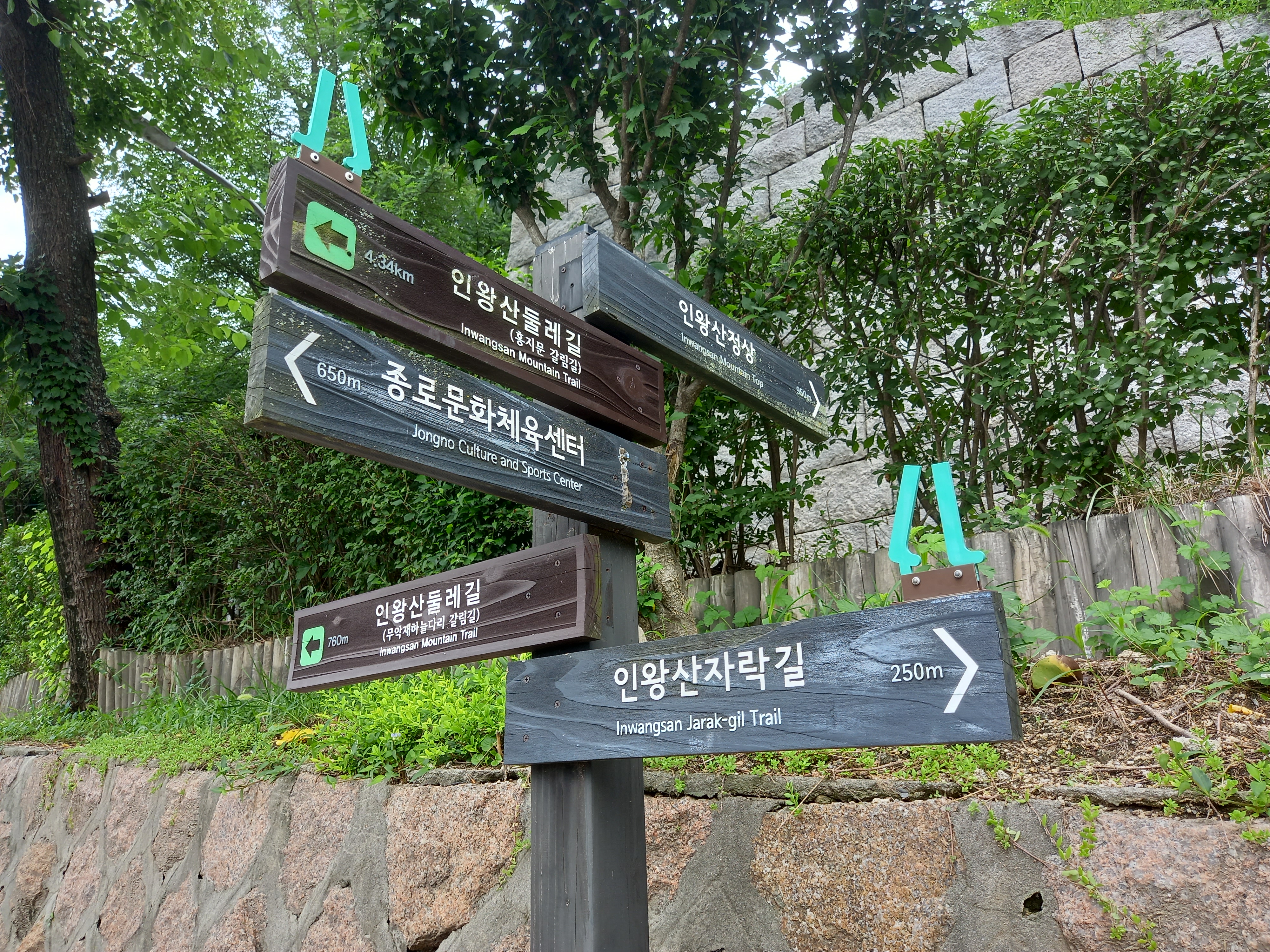 →이정표(12:08 / [좌측] 종로문화체육센터-650m / [좌측] 인왕산 둘레길[홍지문 갈림길]-4.34Km / [우측] 인왕산 정상-950m / [직진] 인왕산자락길-250m / [직진] 인왕산 둘레길[무악재 하늘다리 갈림길]-760m)