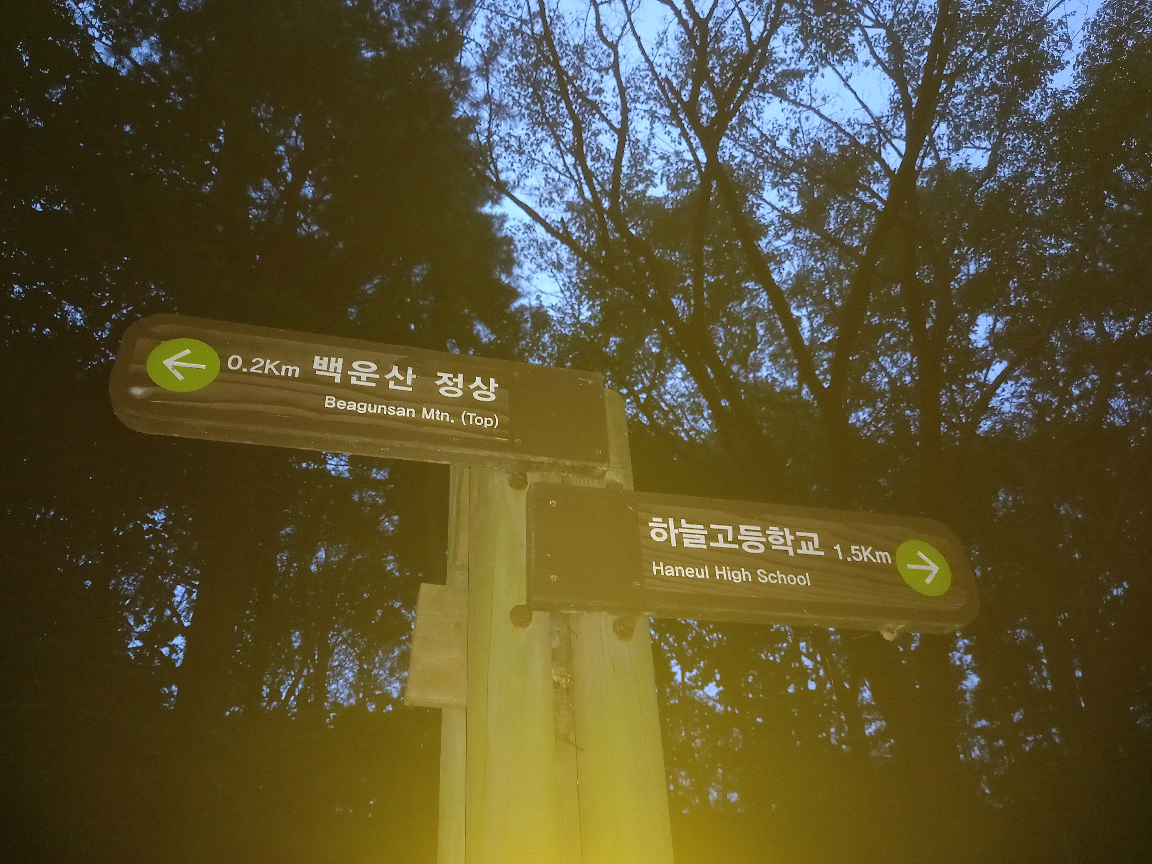 →이정표(19:31 / [좌측] 하늘고등학교-260m / [후] 백운산 정상-1.1Km / [우측] 운북동-1.3Km)