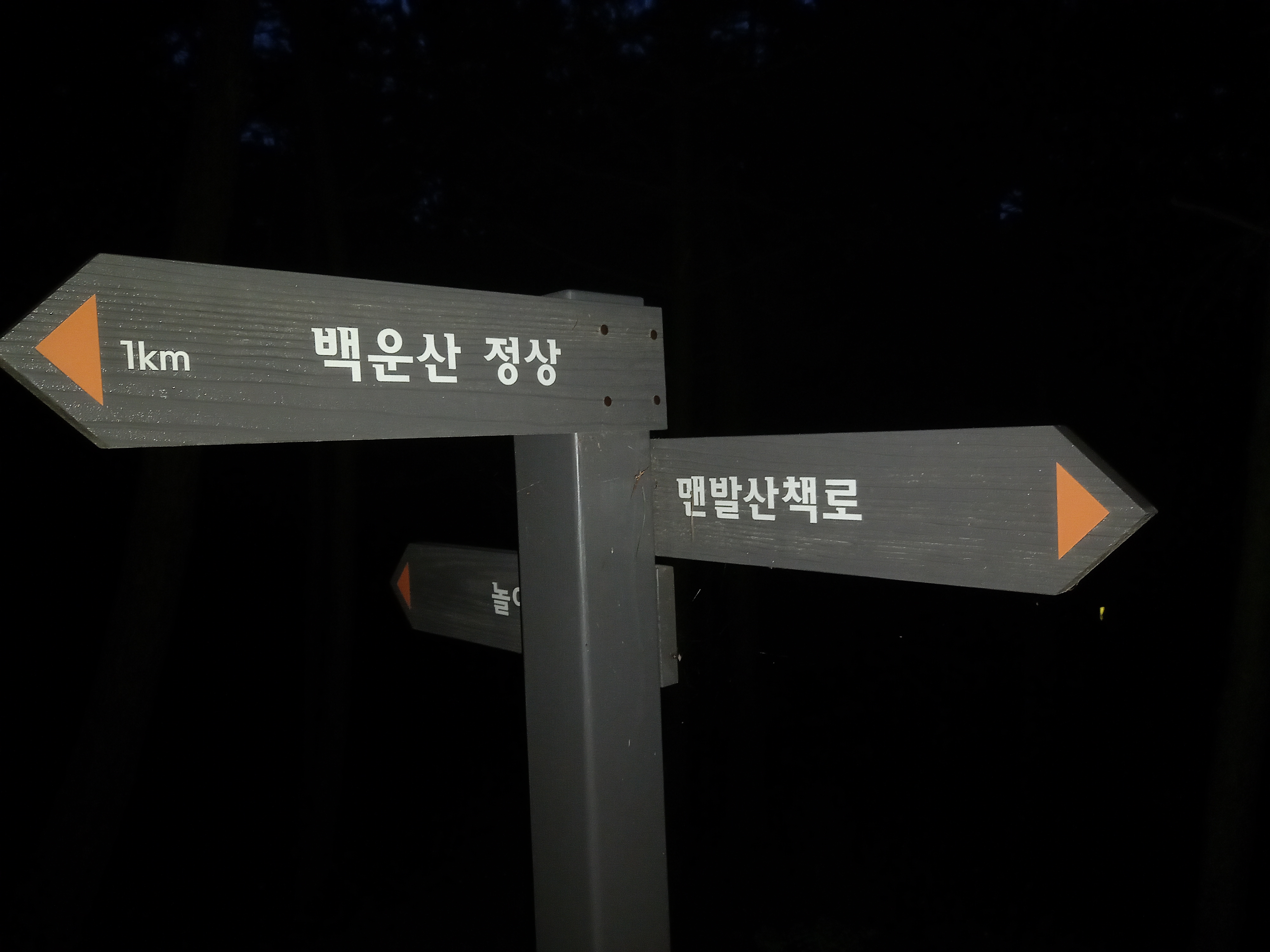 →이정표(19:30 / [좌측] 놀이쉼터 / [후] 백운산 정상-1Km / [우측] 맨발 산책로)