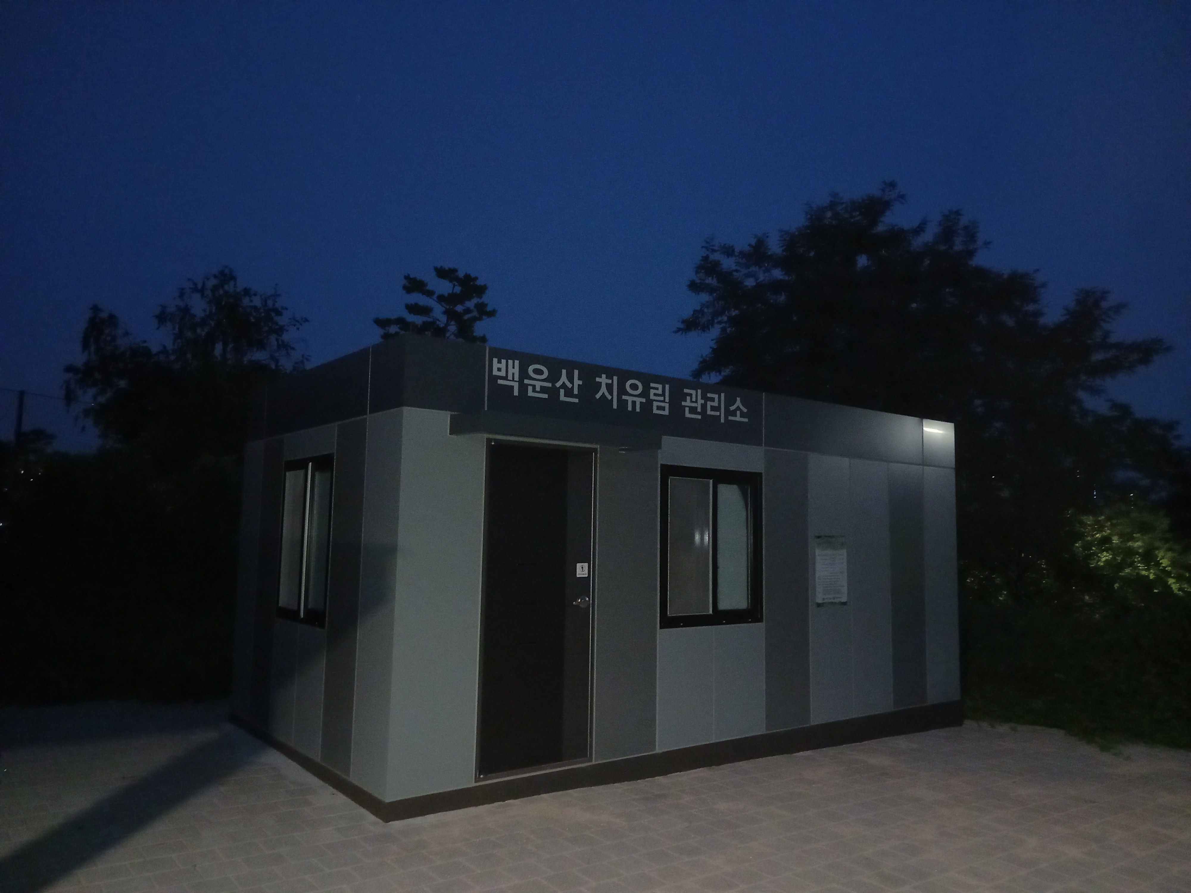 <하늘고등학교 방면 등산로 입구의 백운산 치유림 관리소 건물>
