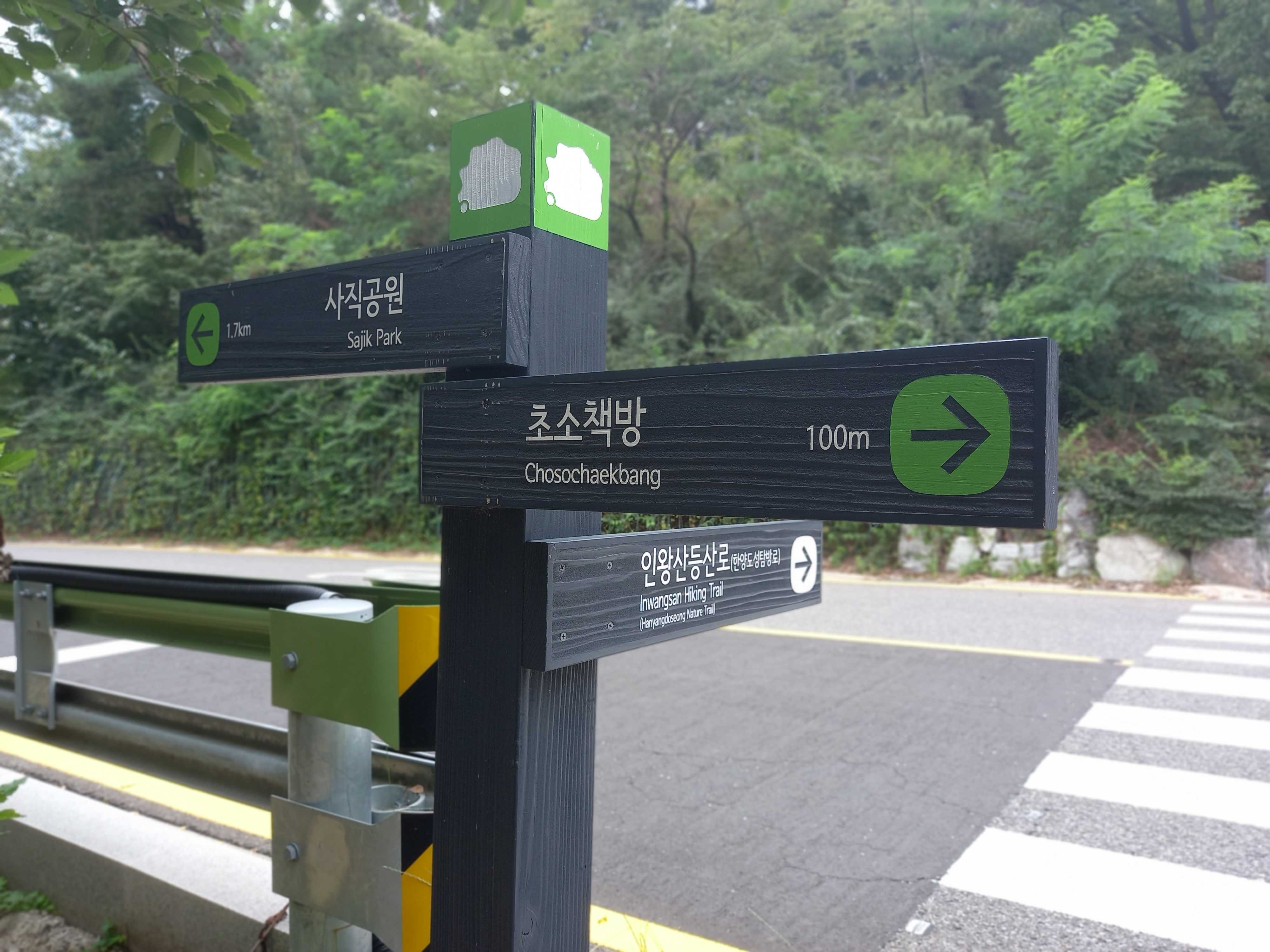 <초소책방에서 사직공원과 인왕산 등산로 방면 갈림길 이정표>