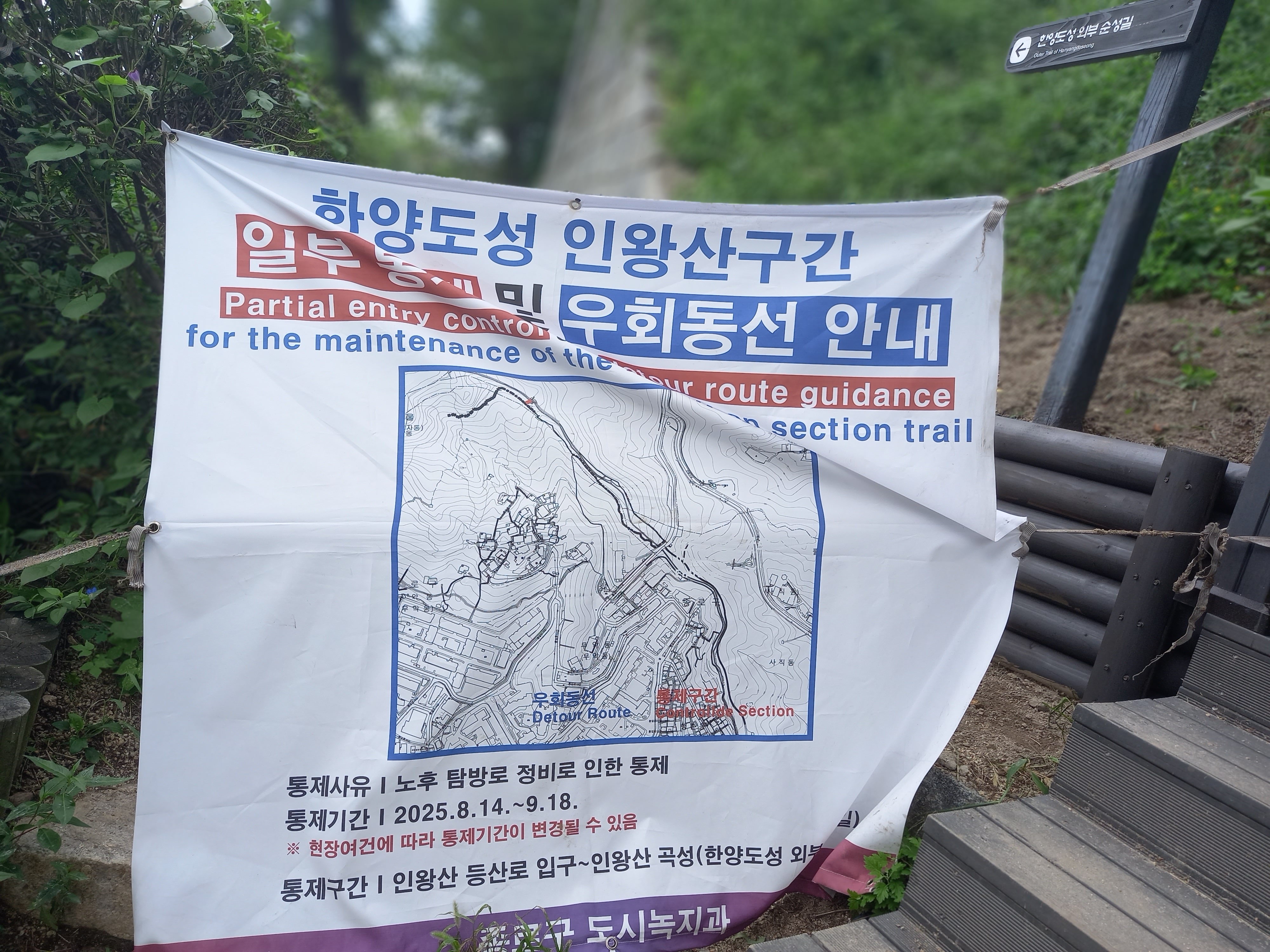 <한양도성 외부 순성길 입구의 통제 안내 현수막>