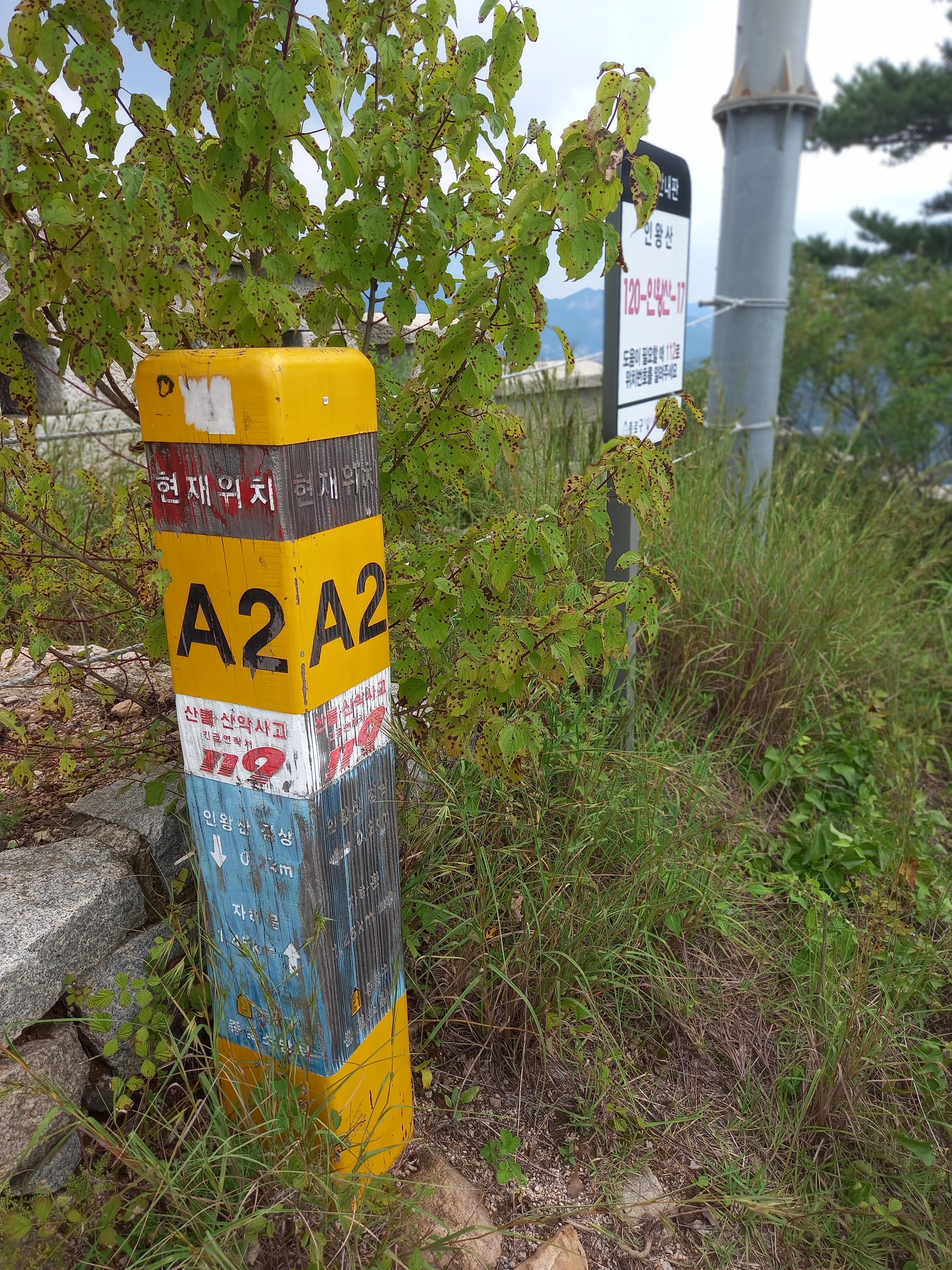 <기차바위 갈림길의 현재위치 A2 이정표와 위치 안내판>