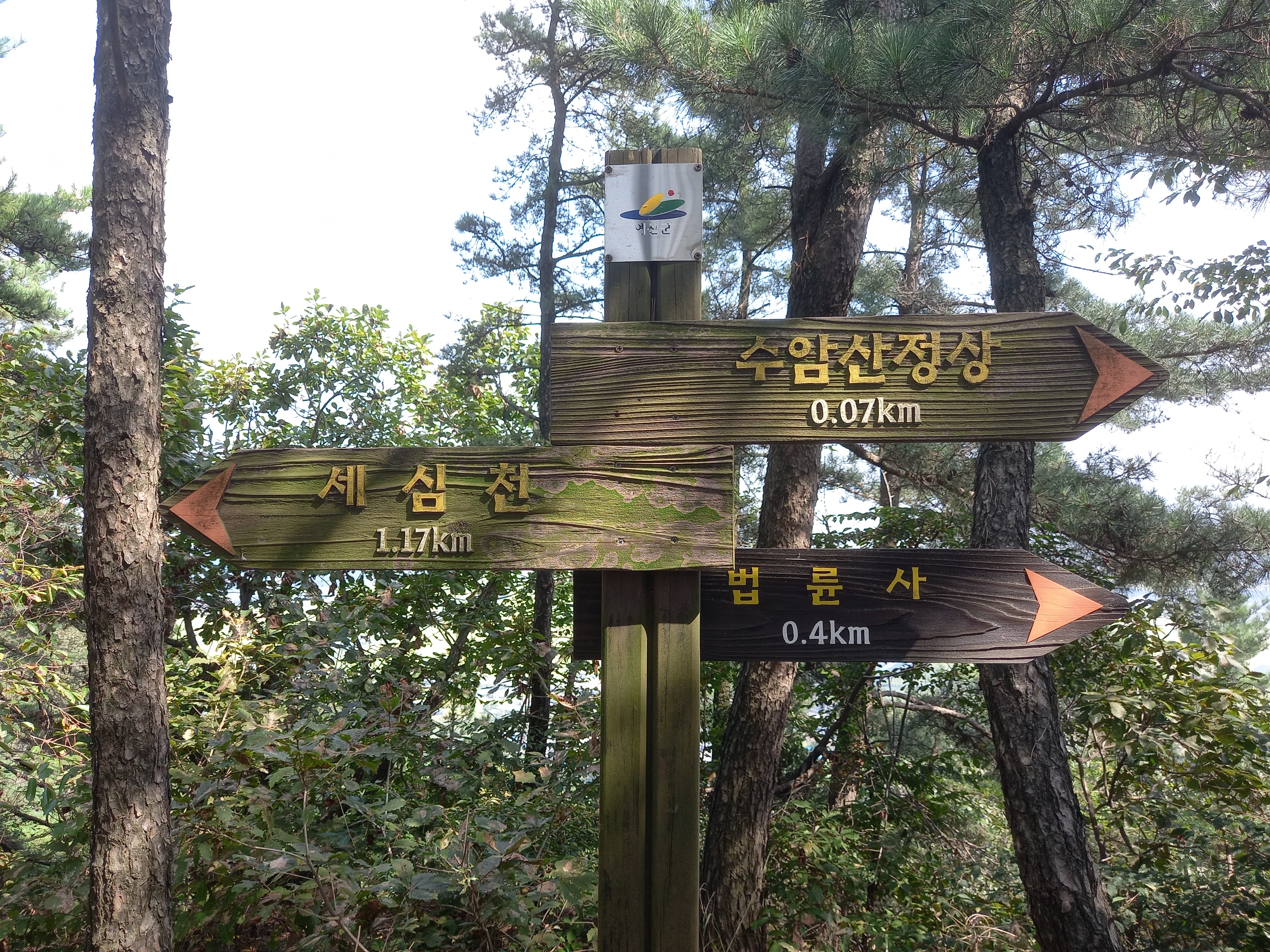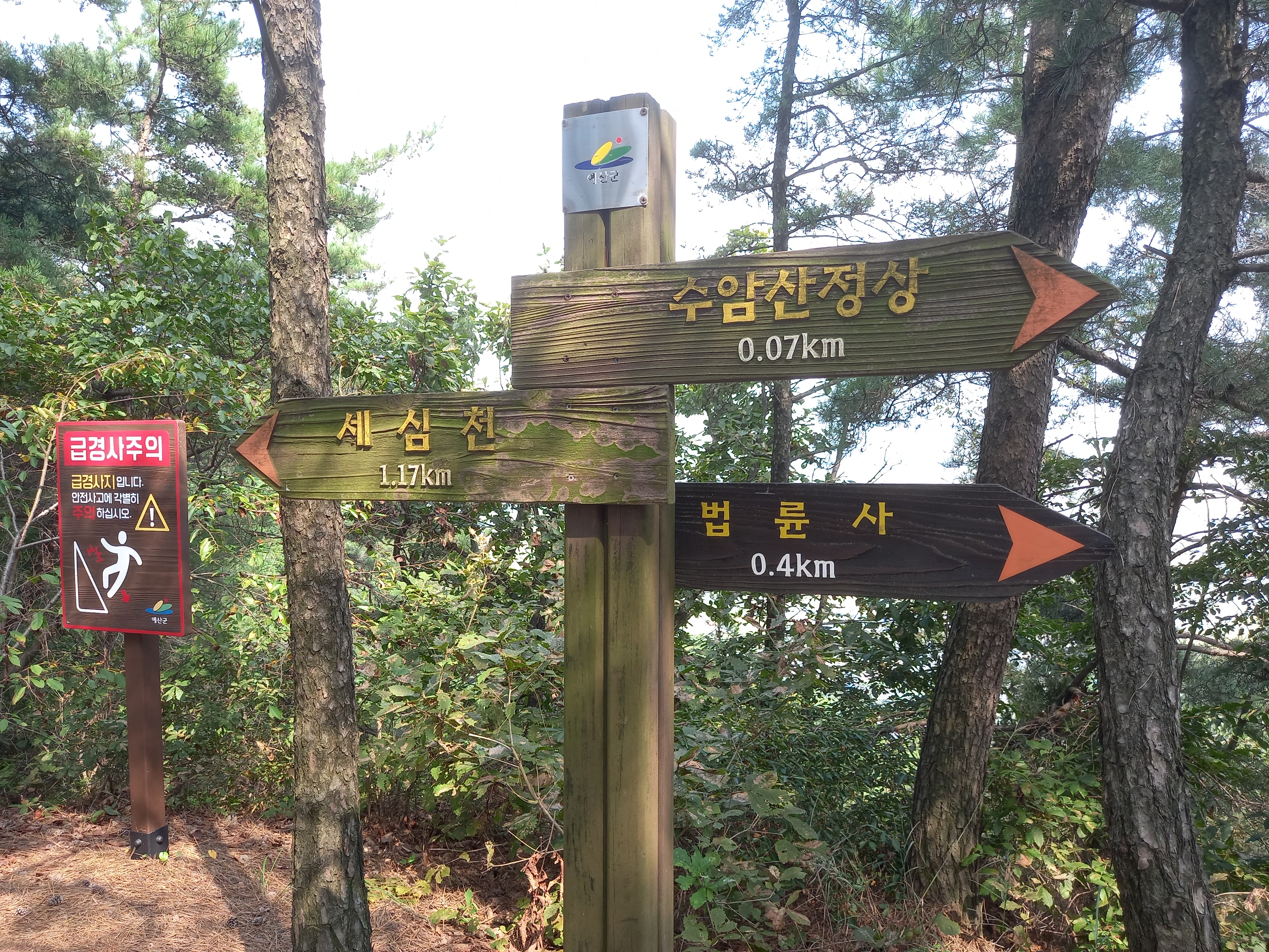 <법륜사에서 수암산 정상과 세심천 방면 갈림길 이정표>