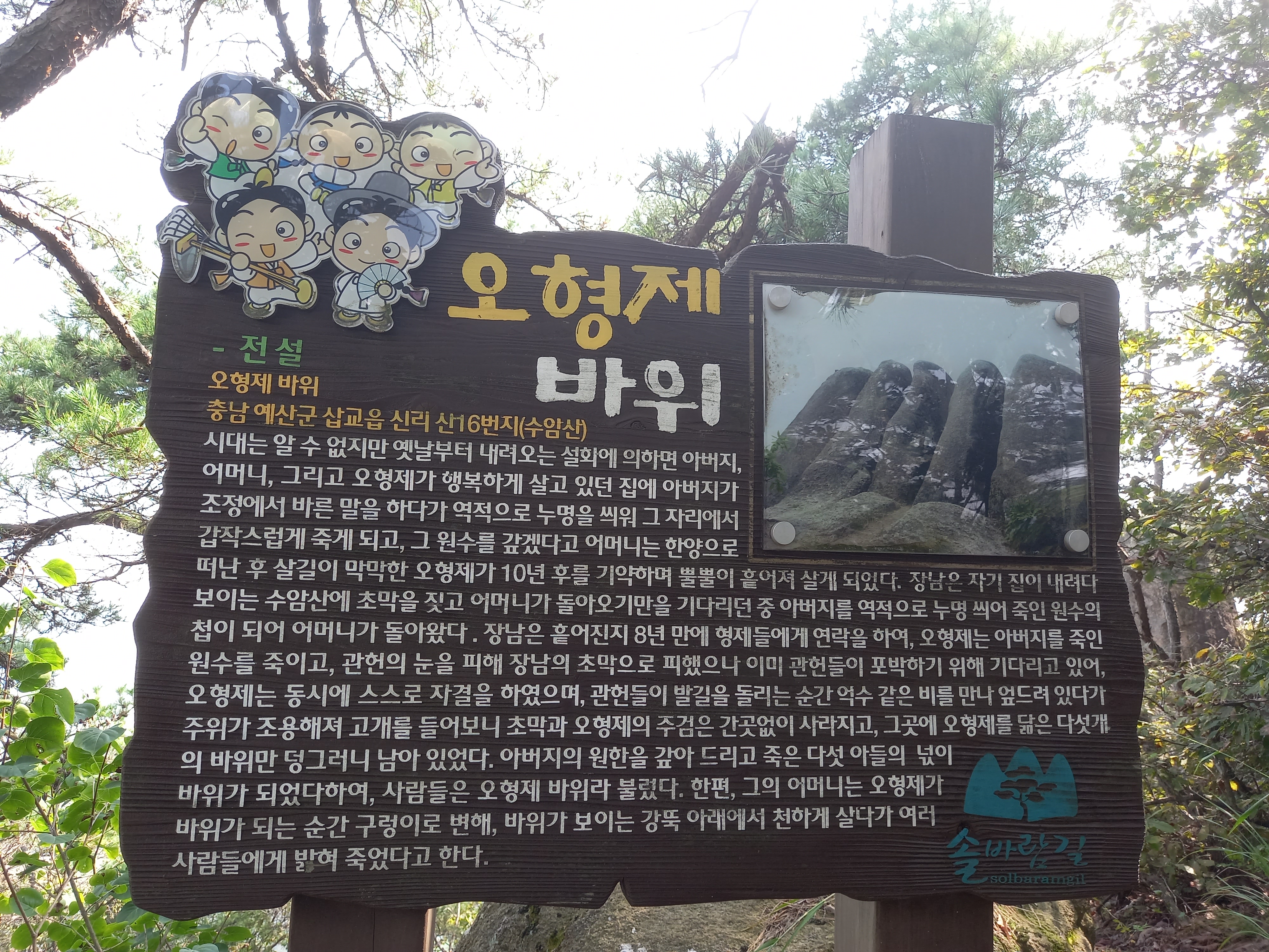 <수암산 정상에서 용봉산 방면 능선의 오형제바위 안내문>