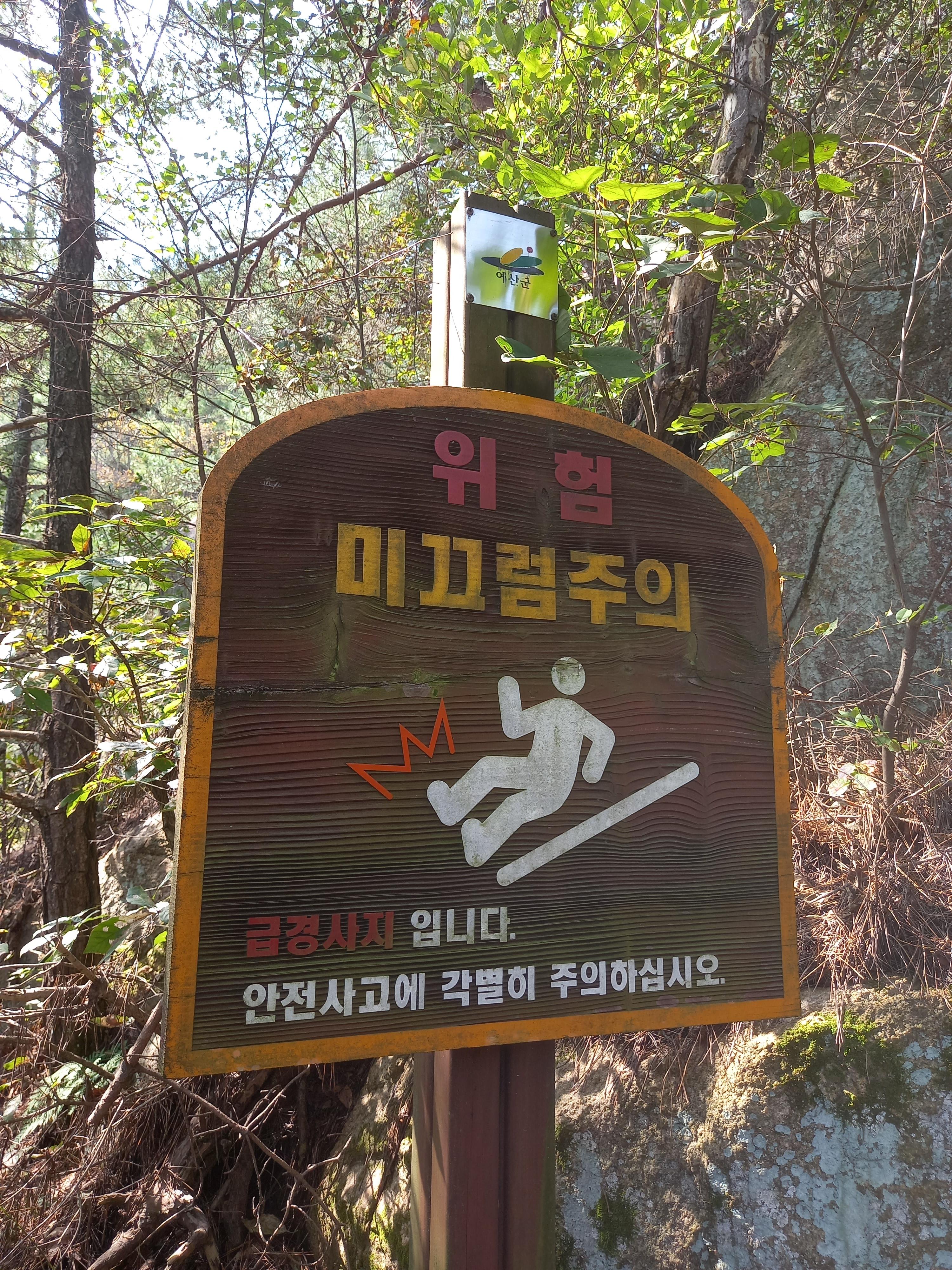 <법륜사에서 수암산 정상 방면 등산로의 미끄럼주의 안내문>