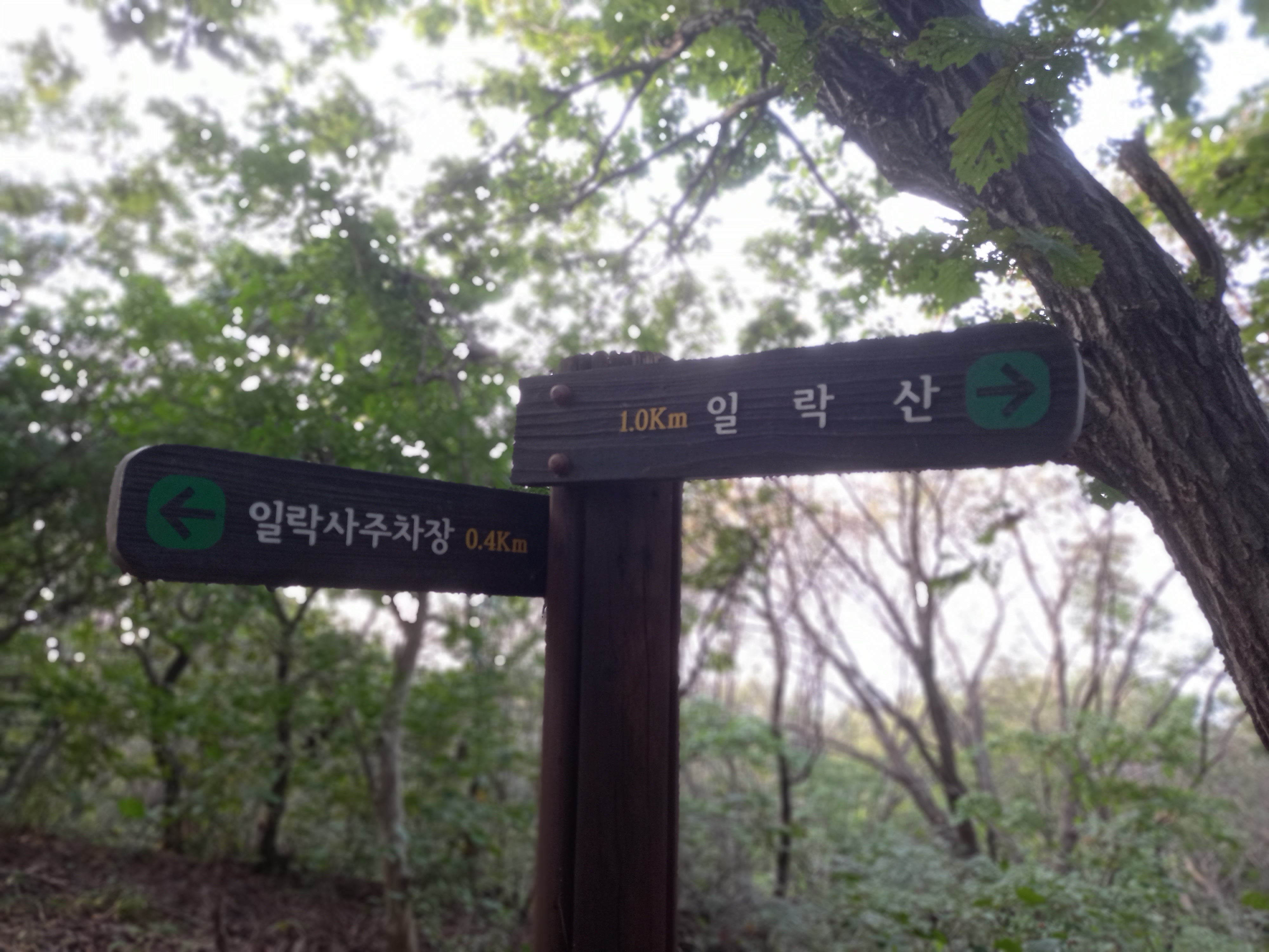 <일락산 정상에서 일락사 주차장 방면 이정표>