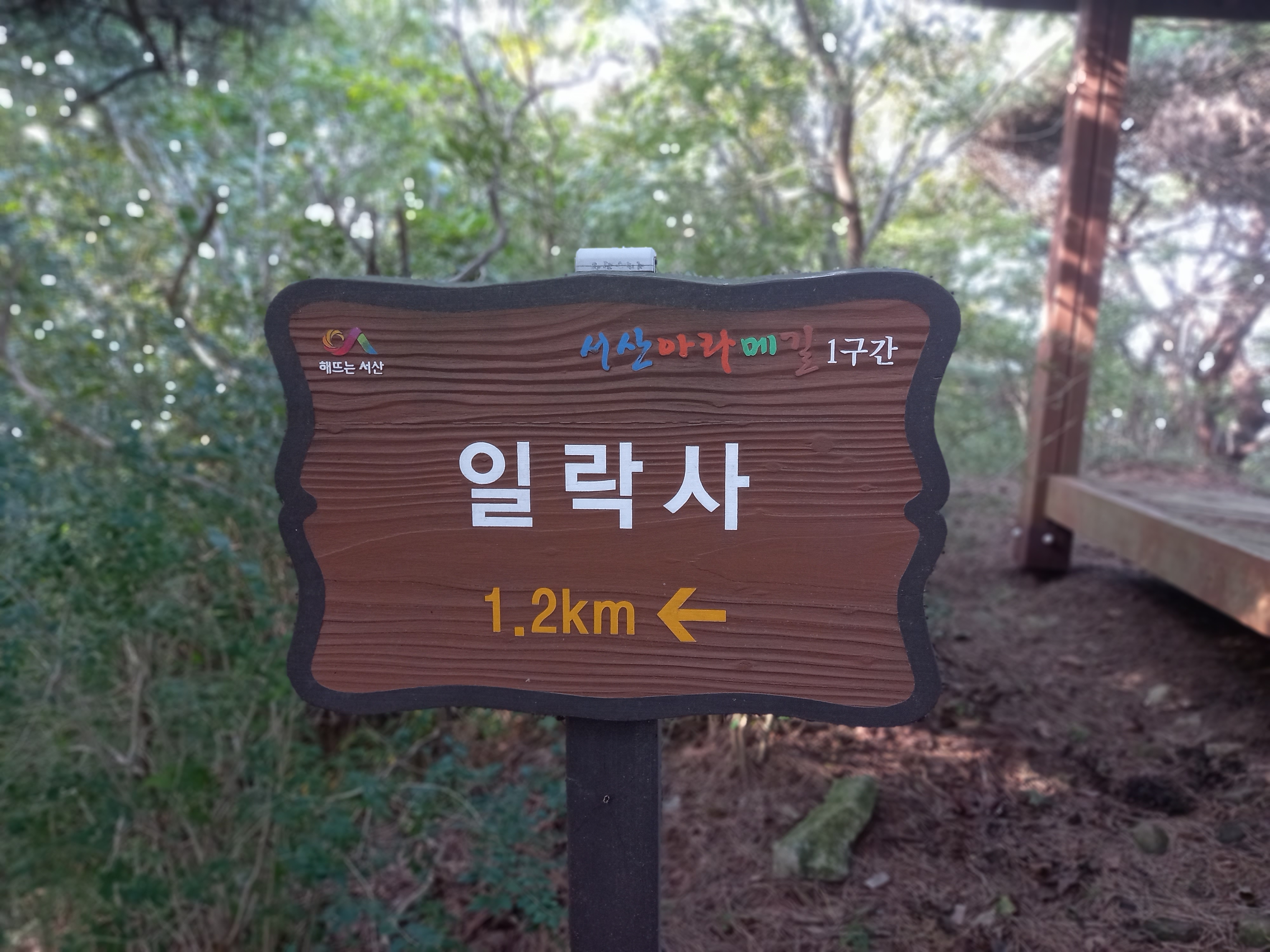 <일락산 정상에서 일락사 방면 하산로의 내포문화숲길 인식표>