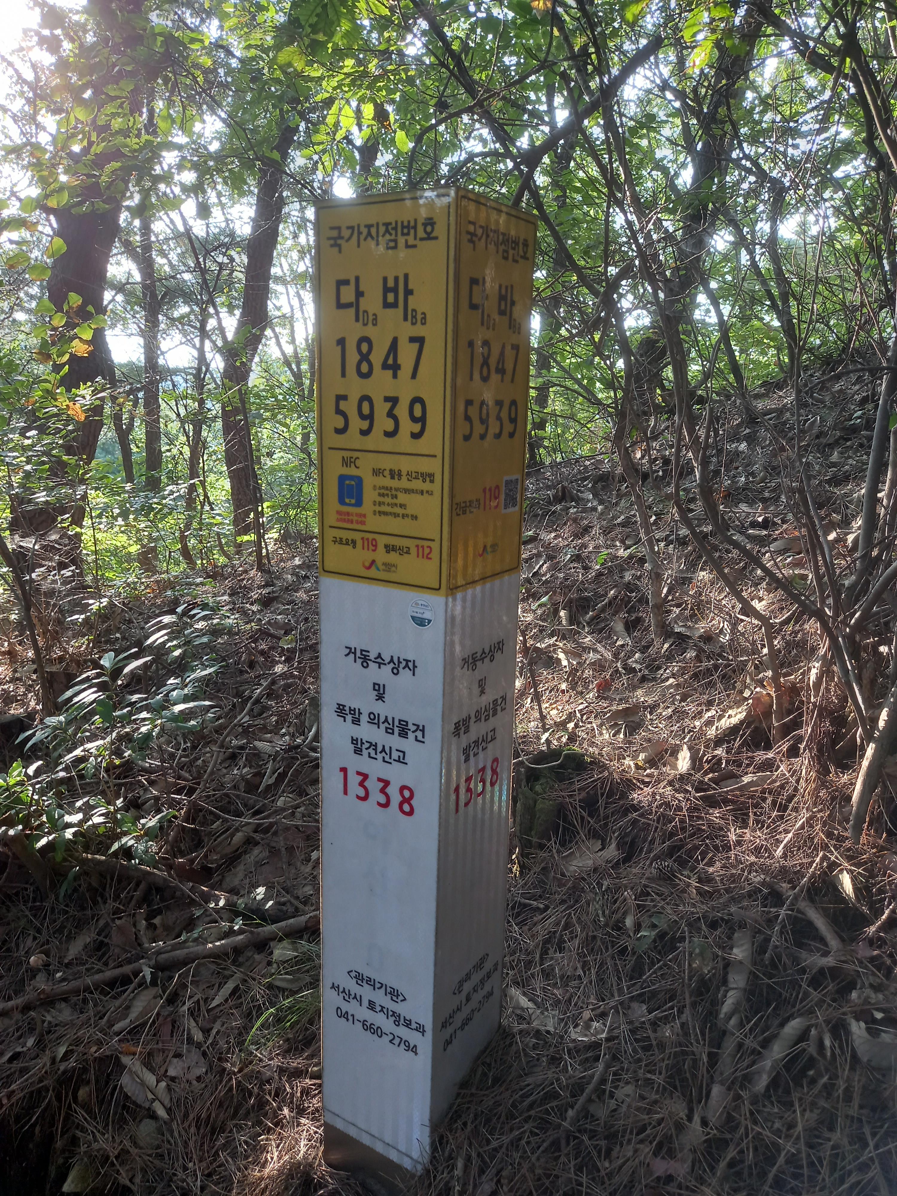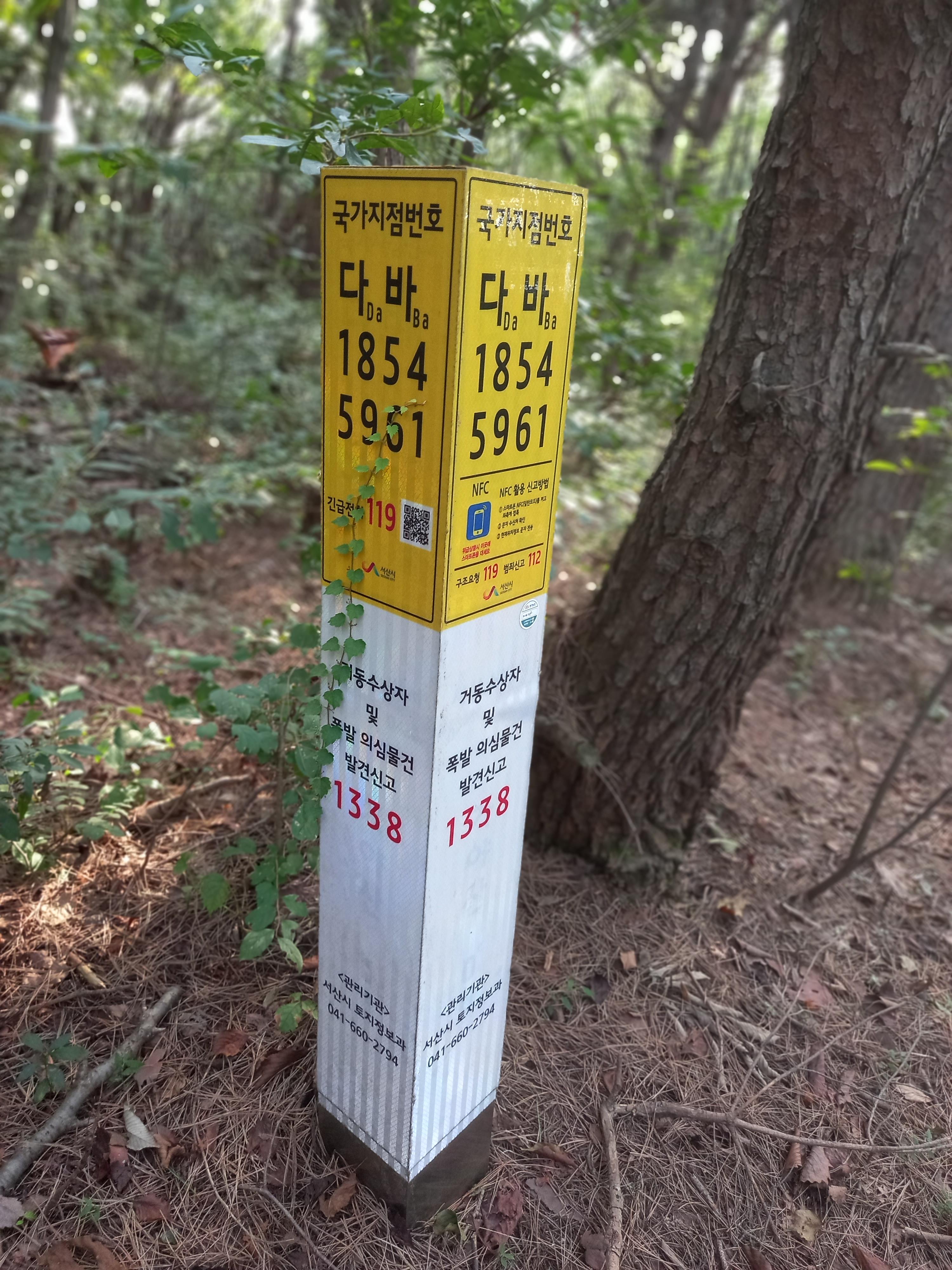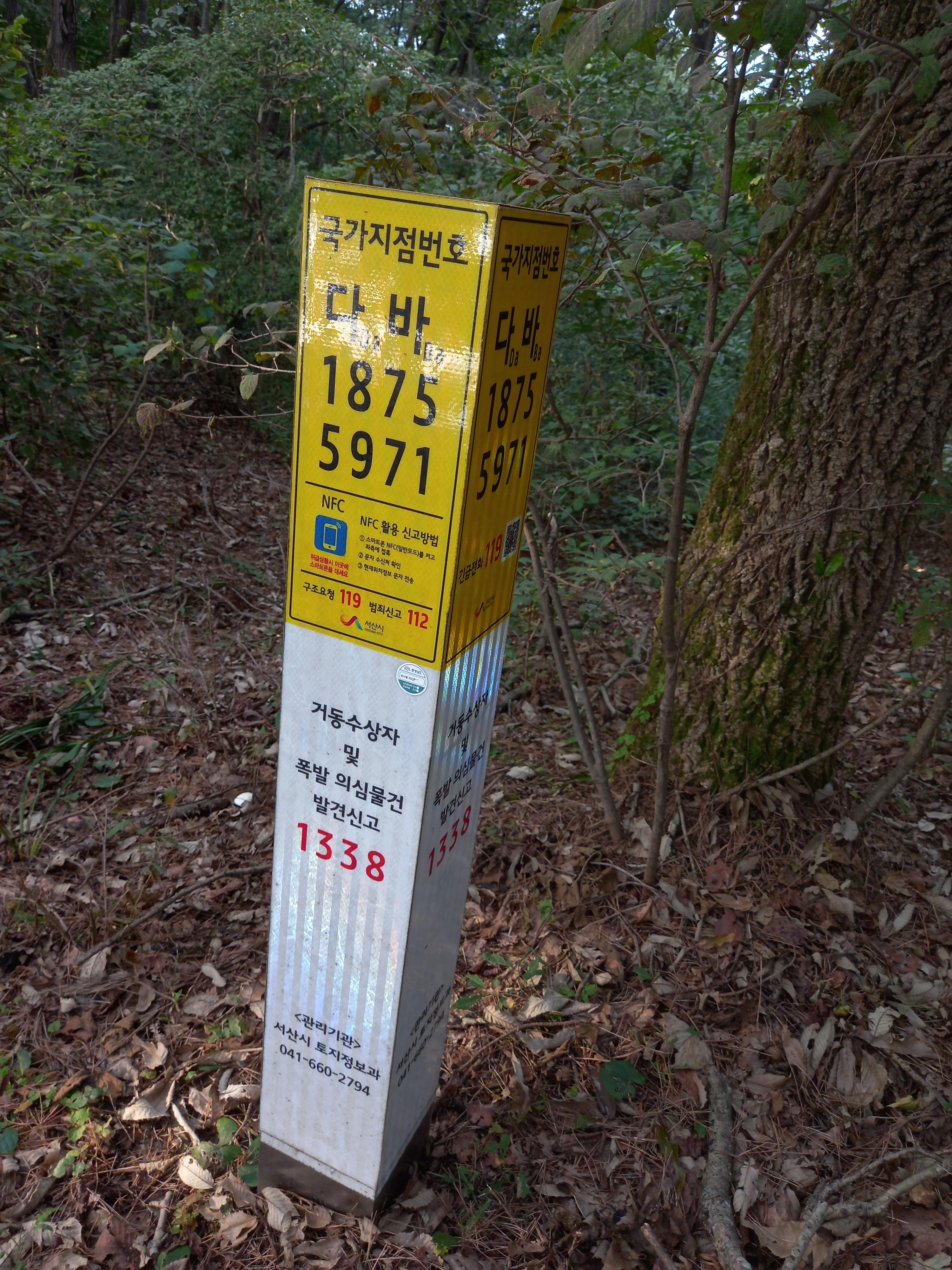 <일락사에서 일락산 정상 방면 등산로의 국가지점번호 이정표>