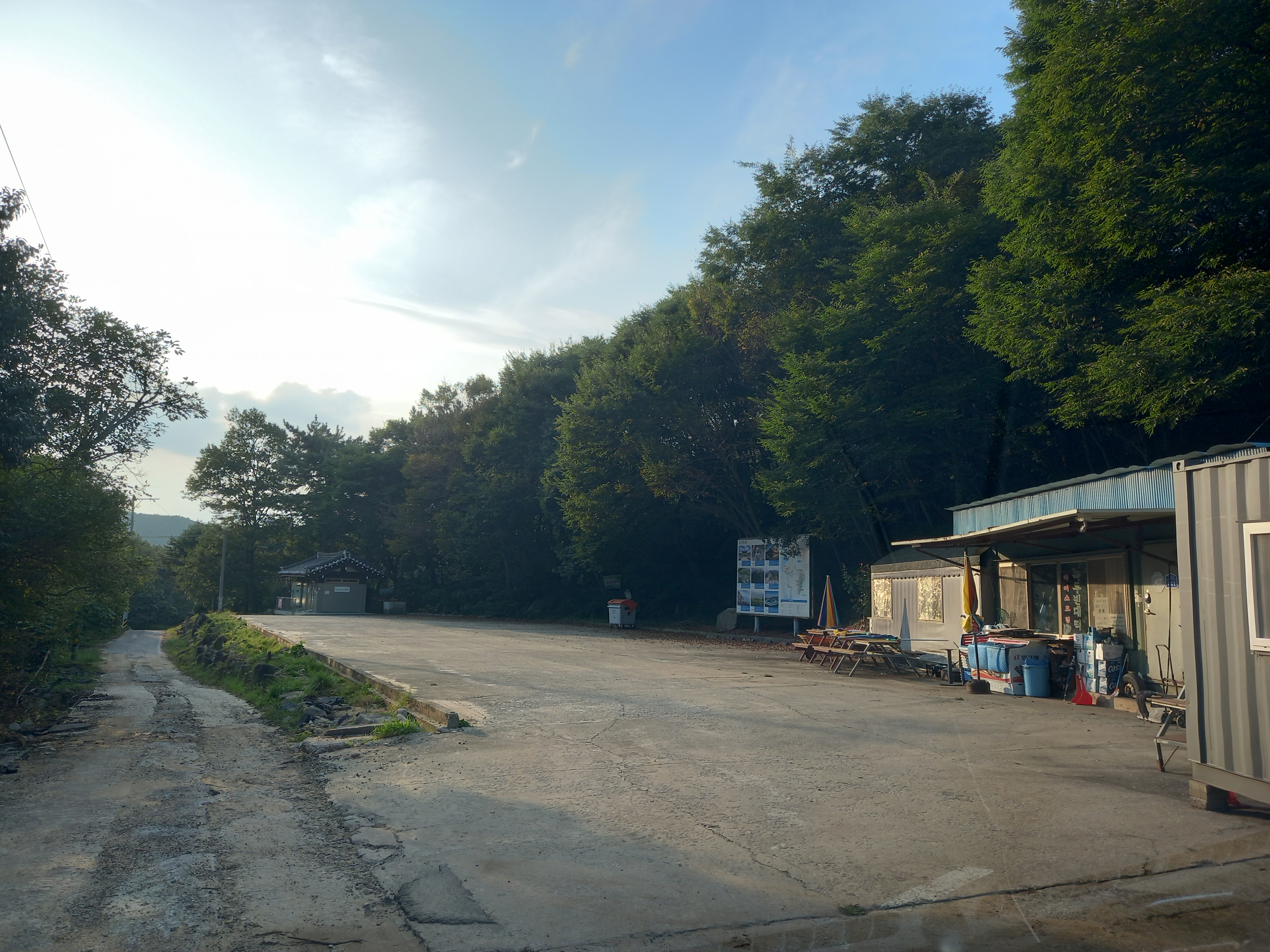 <일락사 입구의 주차장과 상가 건물>