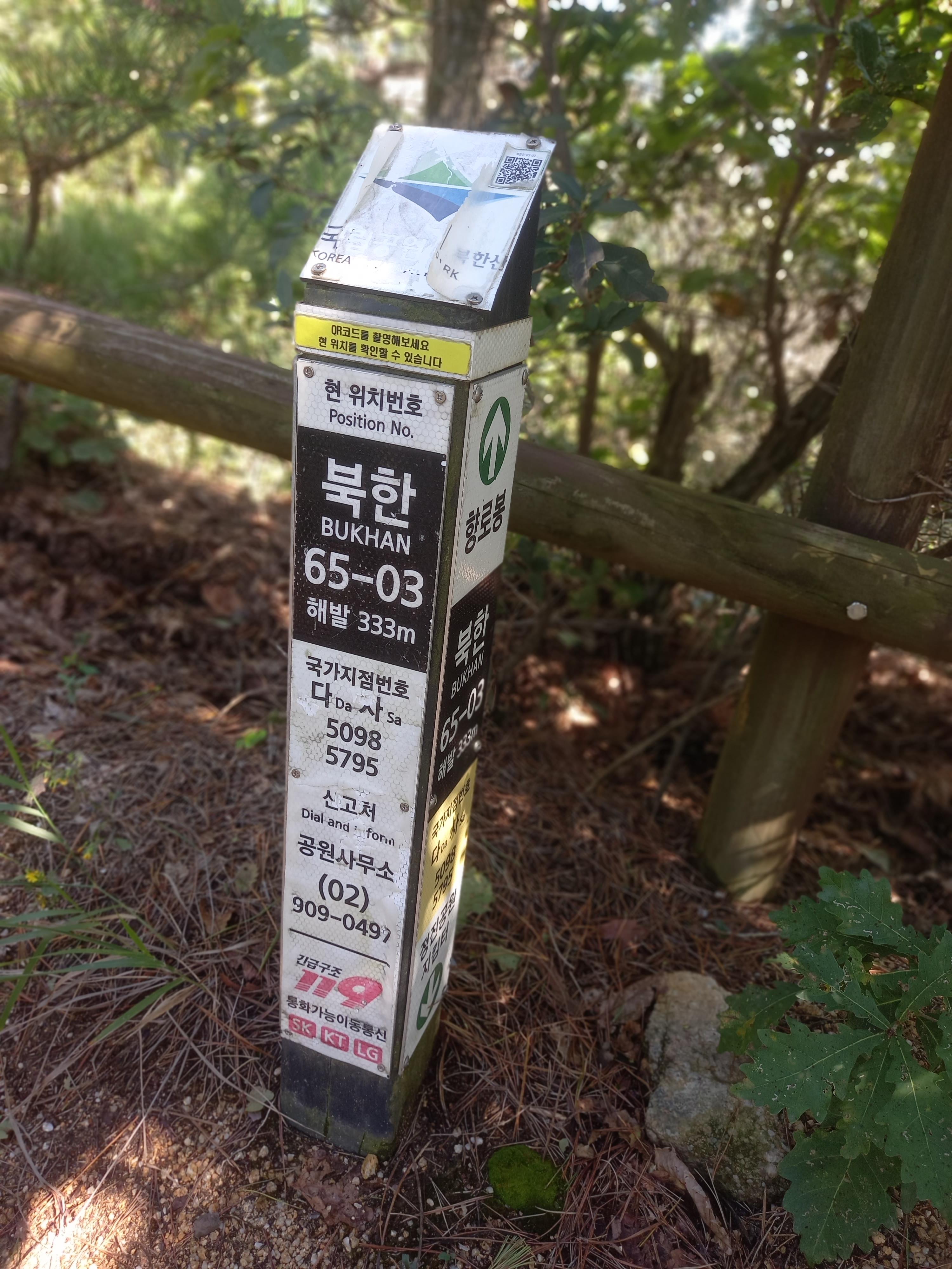 <족두리봉에서 향로봉 방면 등산로의 북한 65-03 이정표>