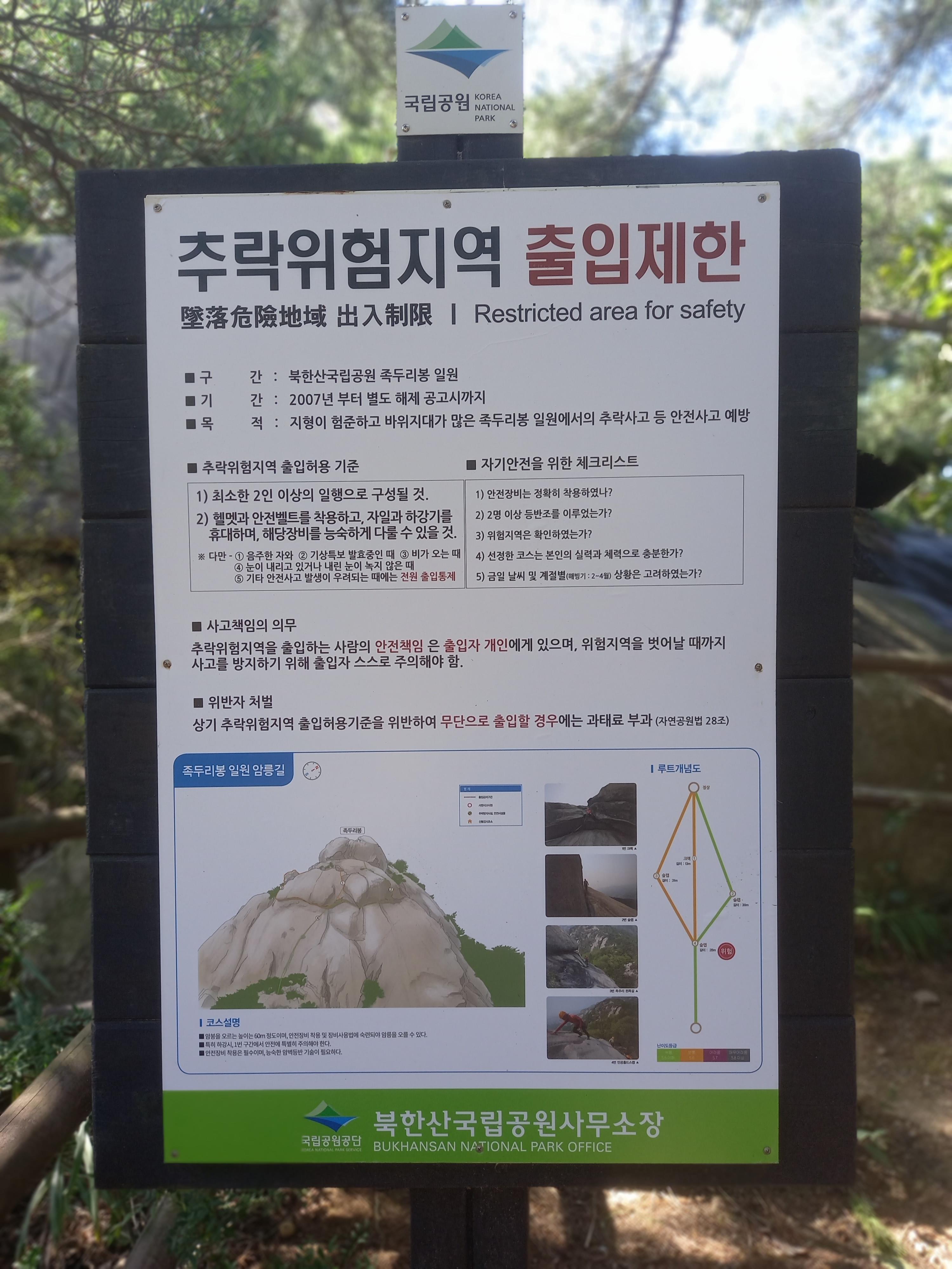 <족두리봉 아래의 추락 위험지역 출입제한 안내문>