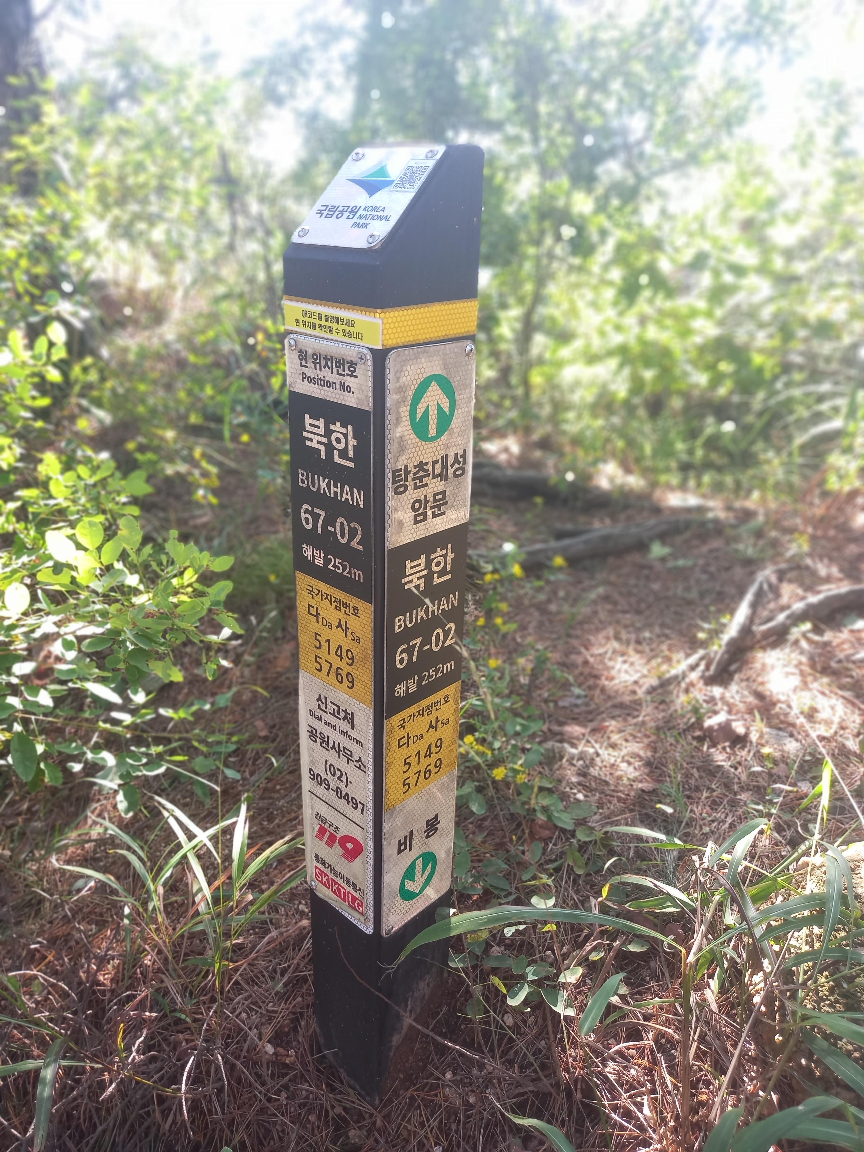 <탕춘대공원지킴터에서 상명대학교 방면 등산로의 북한 67-02 이정표>