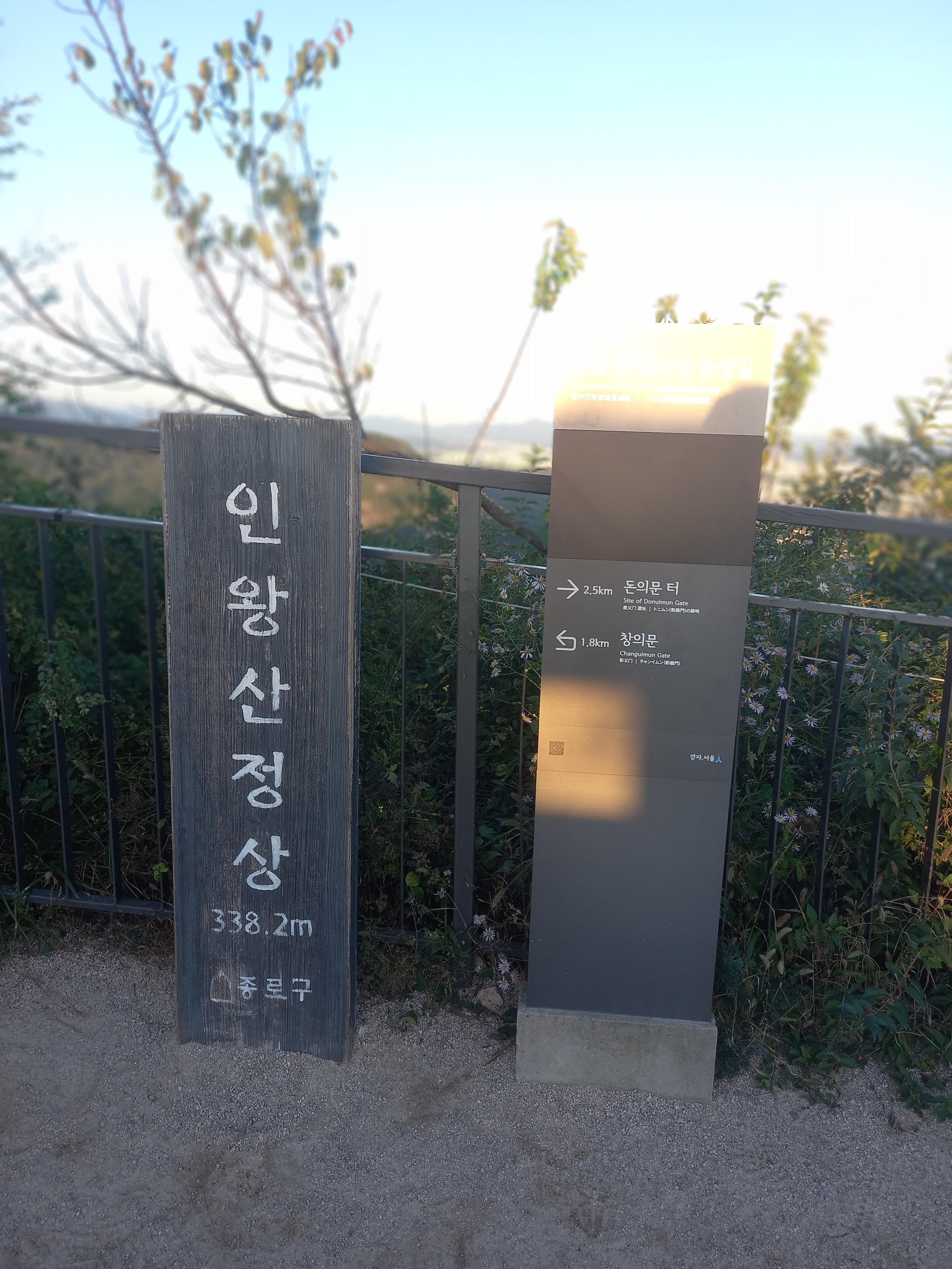<인왕산 정상 표지목과 한양도성 순성길 이정표>