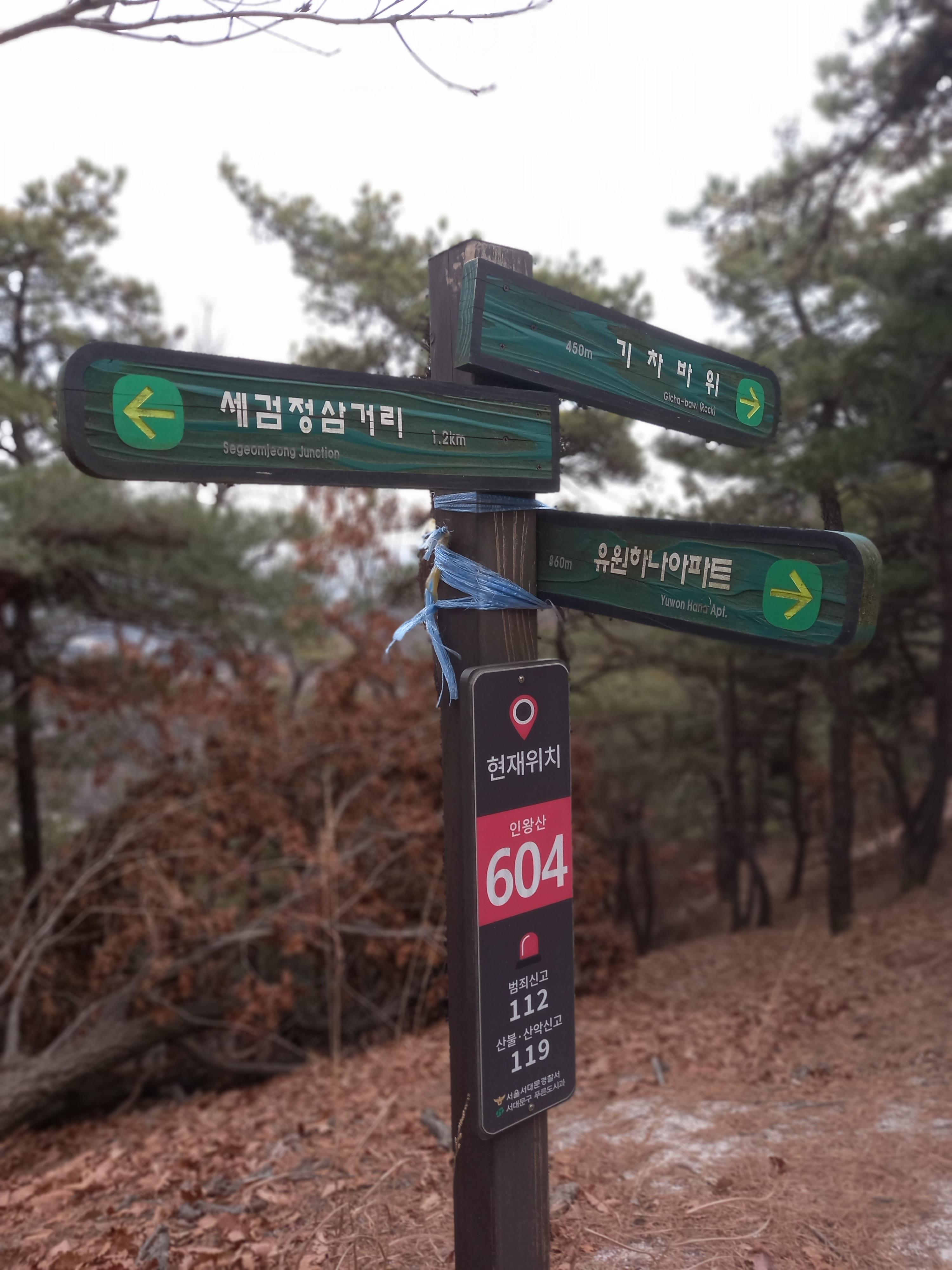 <인왕산 정상에서 종로문화체육센터와 무악재 하늘다리 방면 갈림길 이정표>