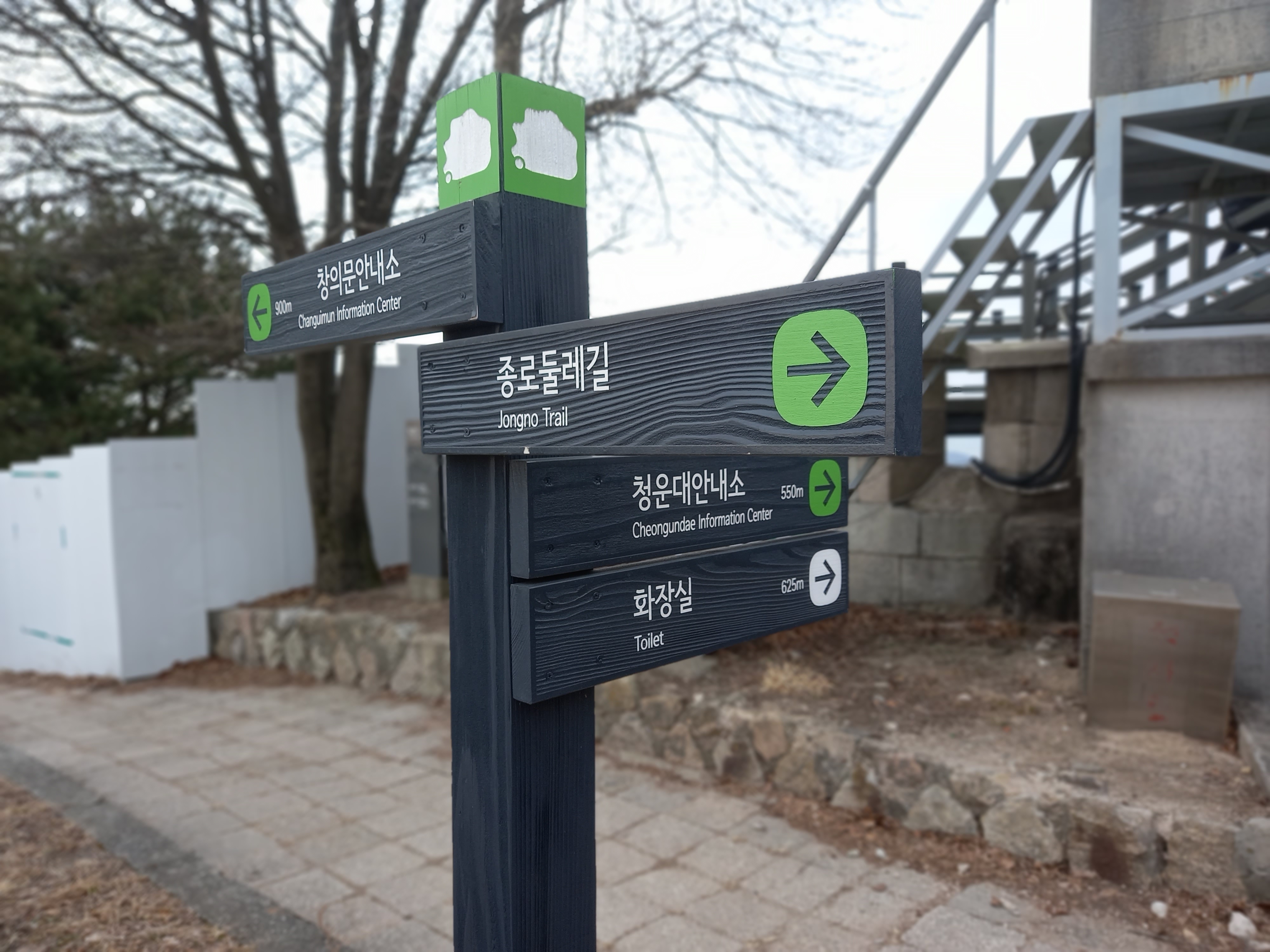 <창의문 안내소에서 청운대 안내소와 종로둘레길 방면 갈림길 이정표(청운대)>