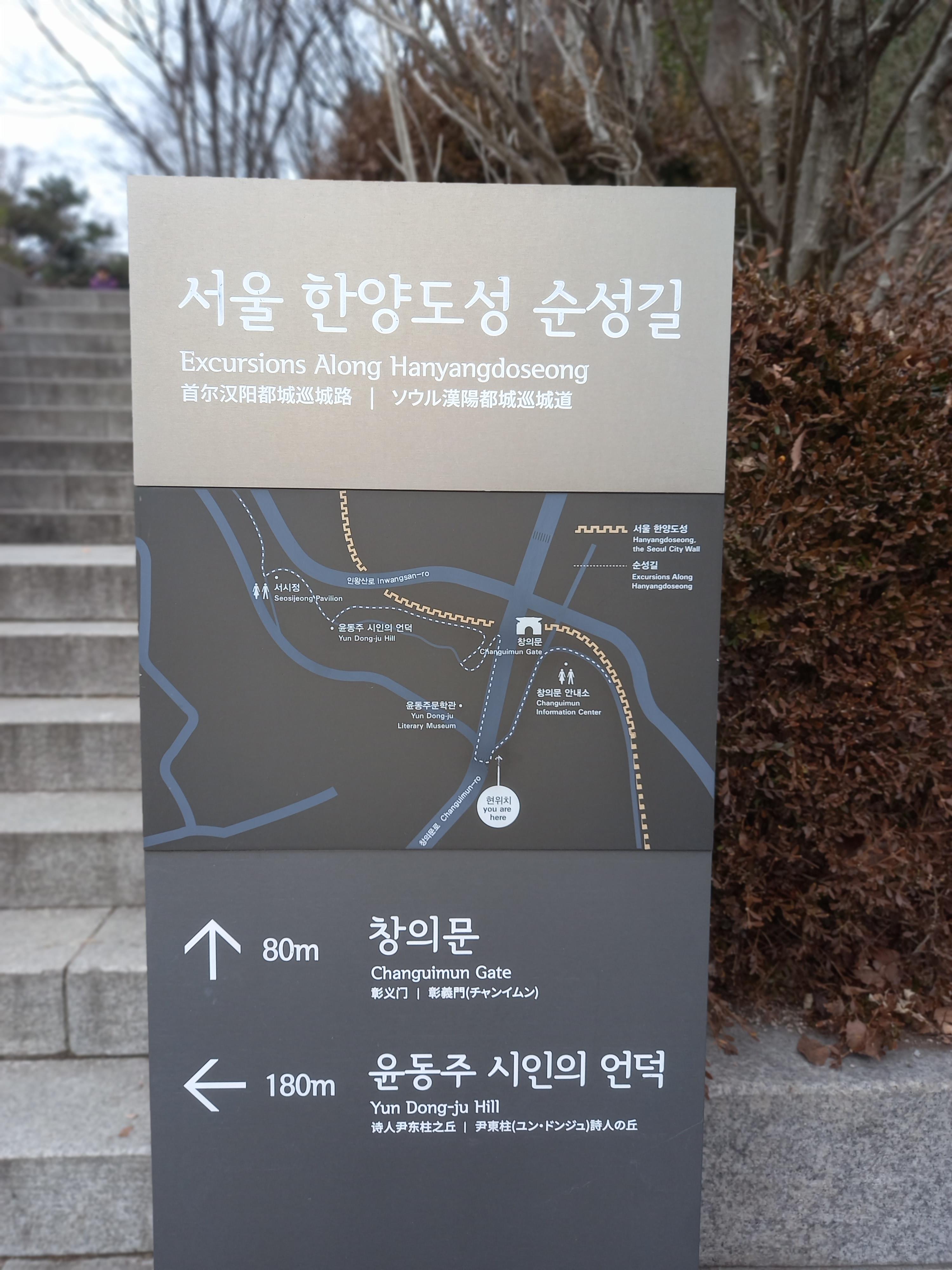 →산행 출발(13:07 / [직진] 창의문-80m / [좌측] 윤동주 시인의 언덕-180m)