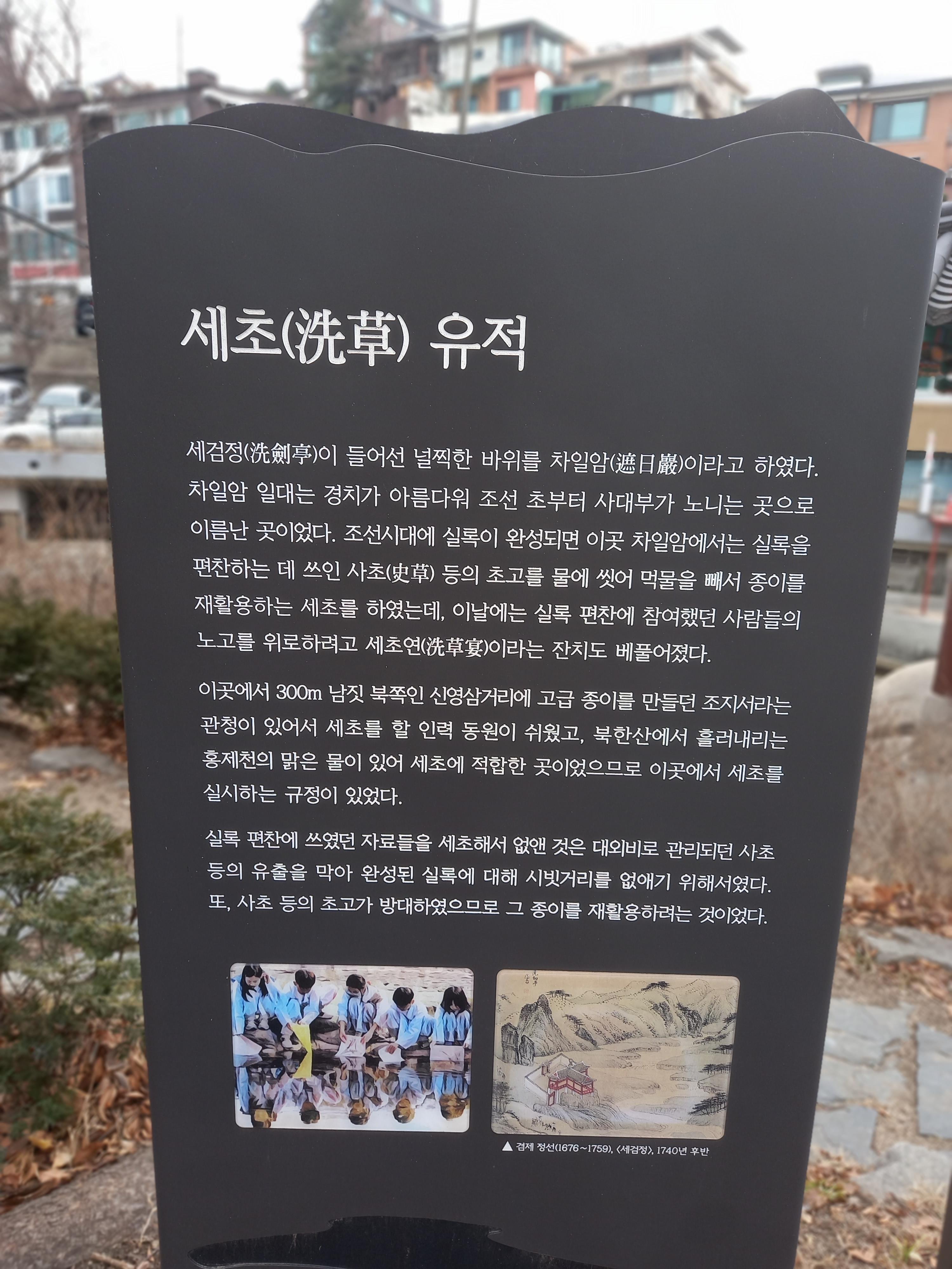 <백사실계곡에서 세검정 방면 도로변의 세초 유적 안내문>