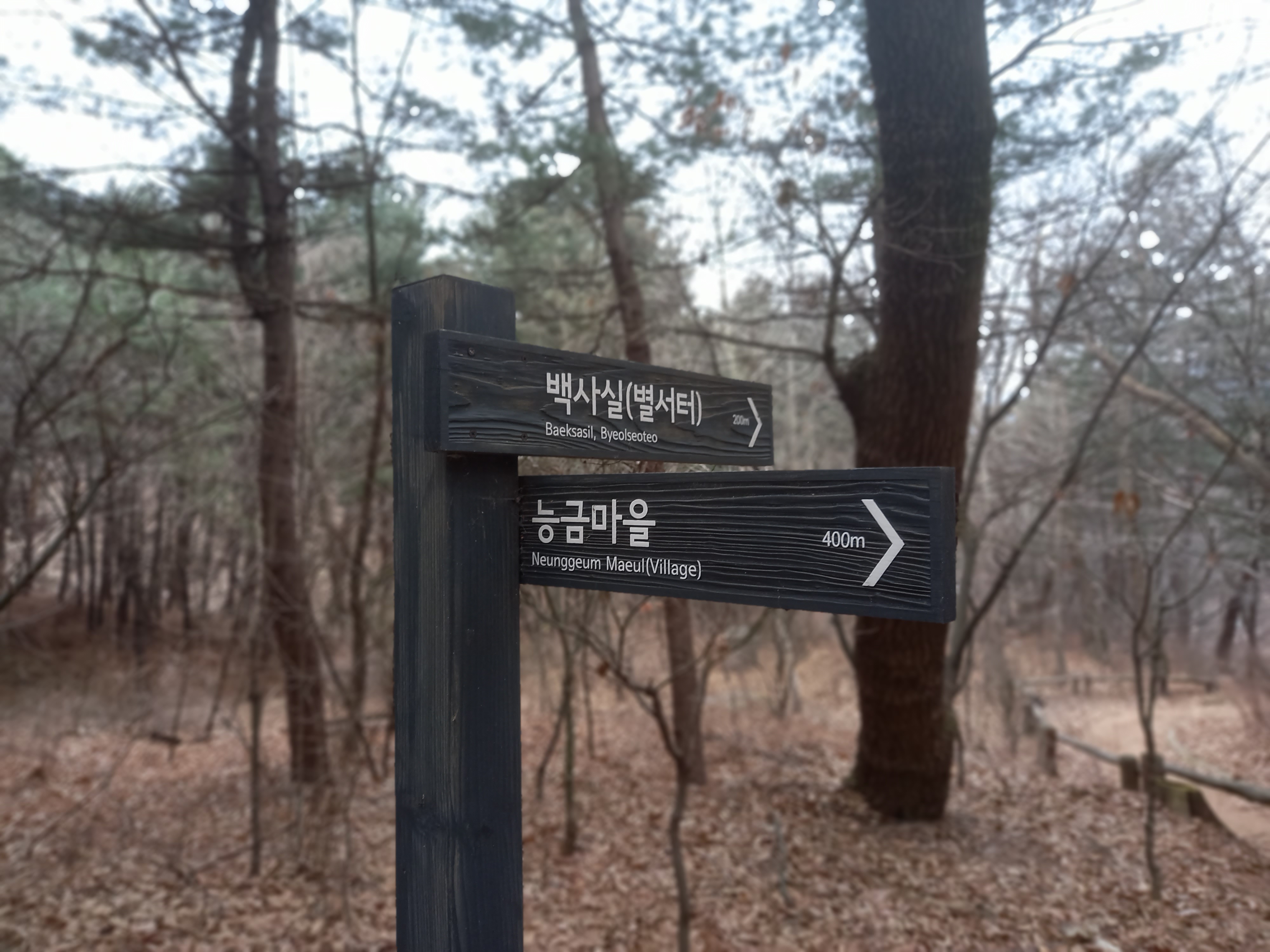 →이정표(14:28 / [후] 능금마을-400m / [우측] 백사실[별서터]-200m)