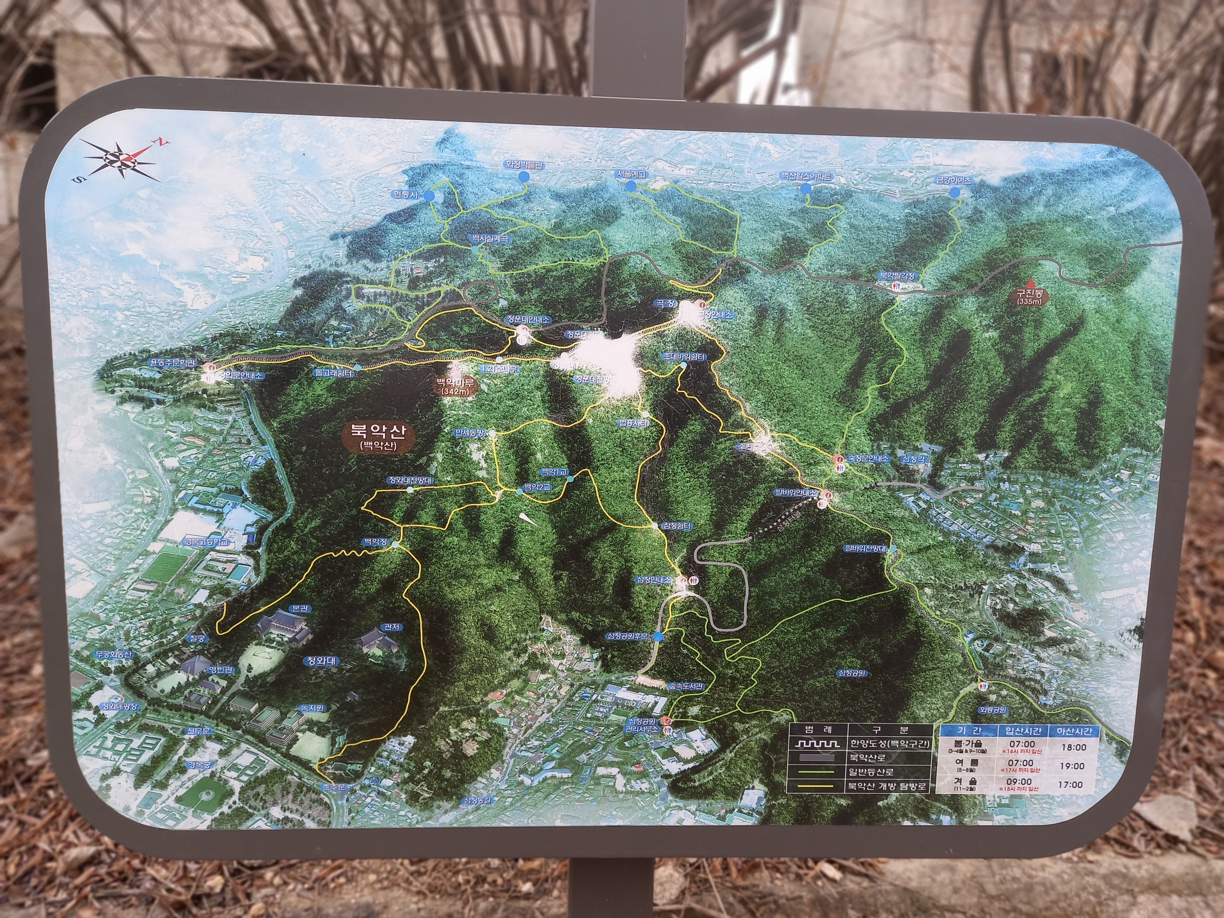 <자하문고개의 북악산 탐방로 안내도와 이정표>